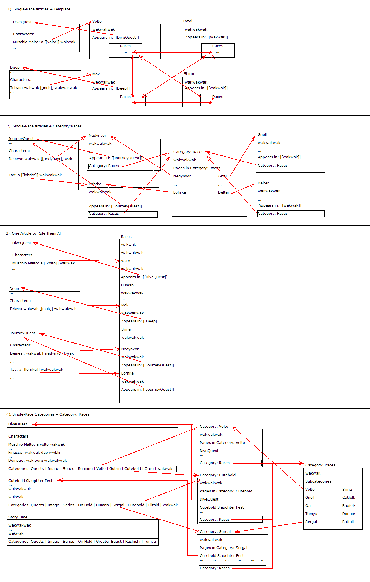 We would create a single [Races] category for all races, for the handful of individuals who are not looking for setting-specific information, but are just genuinely curious about what sort of critters are in the /quest/ world. This would be the full extent that an attempt to centralize races would go - all other effort in races would go into localized spheres of influence. We would create, for example, a 'Races of Cutebold Slaughter Fest' template that could be found on the CSF page linking to the species, a 'Races of Layridin' template to hook together critters from that continuity, etc.