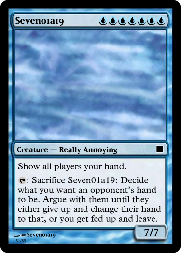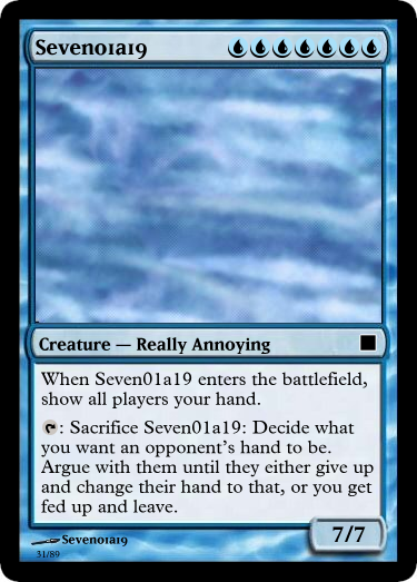 A seven-blue cost 7/7 with a sacrifice to do some strange thing that doesn't itself win the game or obviously make you closer to winning. What an awful card. It doesn't even have flying and it makes you show other players your hand when you play it. I'll be using this one as kindling when I go camping.