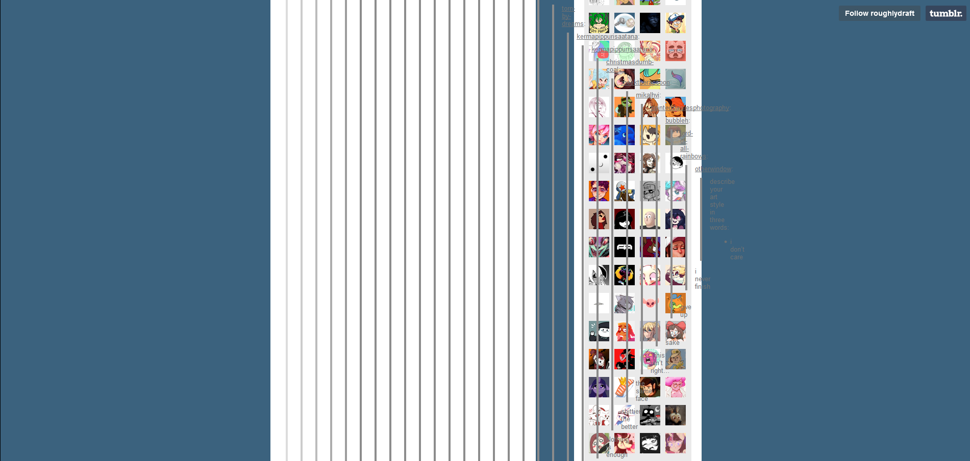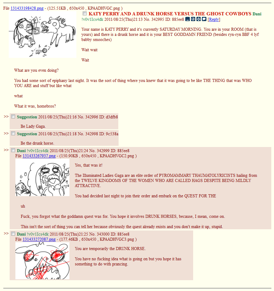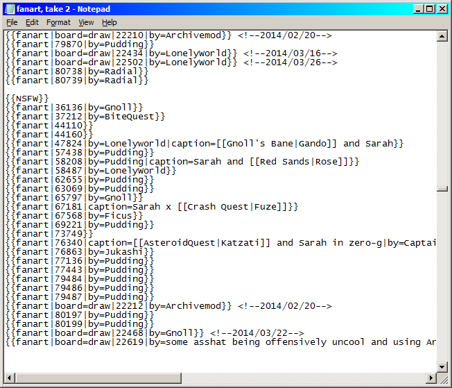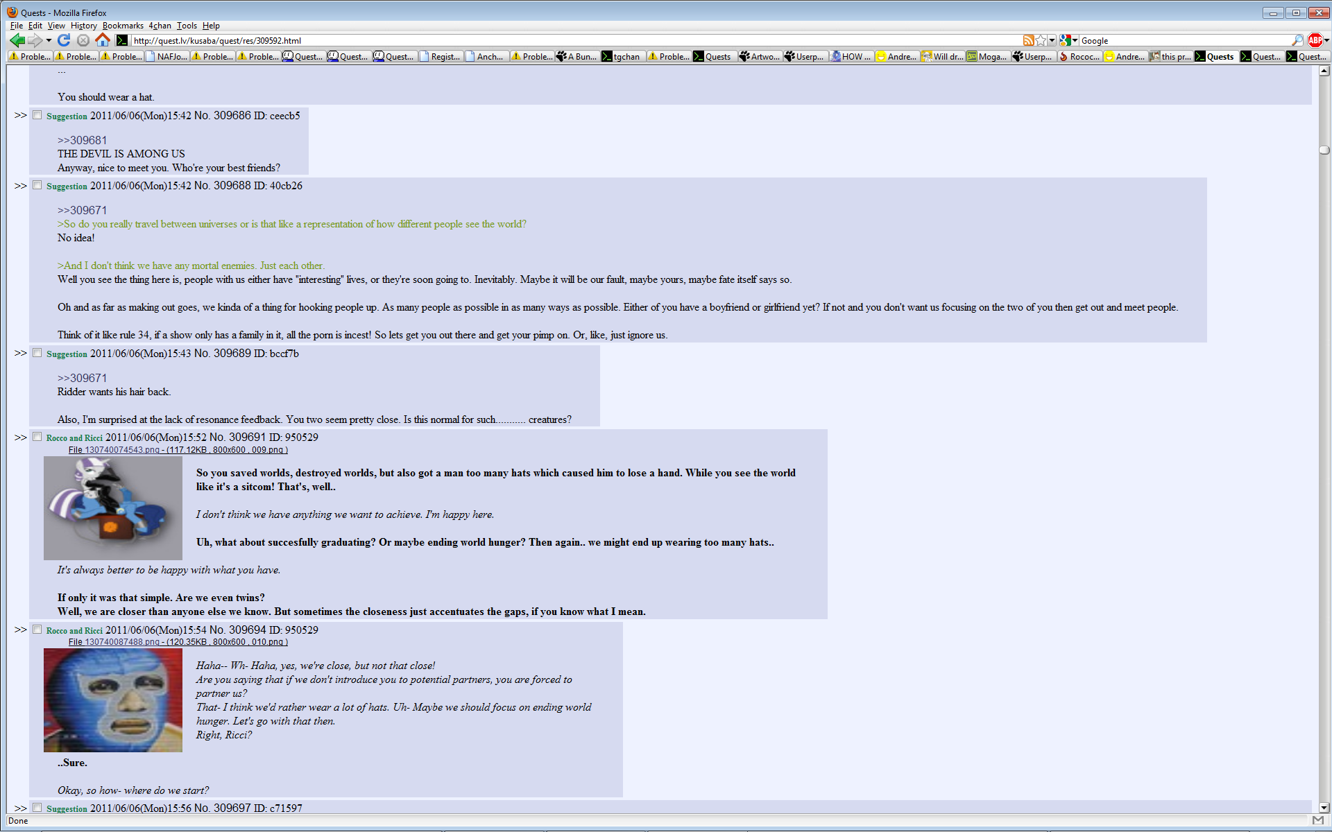 All of RubyQuest. Contains: - Every update image. - The text of every update, and the replies to every update - JSON for machine-processing antics (tight and pretty serialisations) - One huge webpage version (minimalist and a bit quirks-mode debugging-y output, but readable) What it does not contain: - Images in replies. - Any hand-curation to drop out "that's it for tonight" updates or hurr-durr argument suggestions. (Alternatively, "it contains the entire 4chan Ruby experience, without having to click on 868 thumbnails or find the right thread for the bit you're after or see any anime image macros".) - Hyperlinks between posts - Any of the discussion threads or fanart. You can scrape those easily enough and they don't have any interesting particularly structure or ordering. Because suptg is penises.