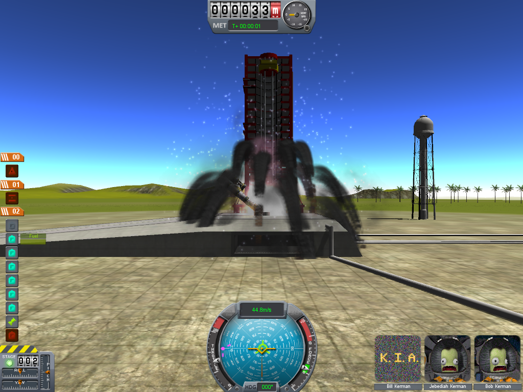 Placed directly under a liquid rocket engine, the command pod exploded and the Flight Events recorded all crew members lost. But Jeb, Jeb would not die. And nor would Bob, in fact. Jeb even resumed grinning shortly after.
