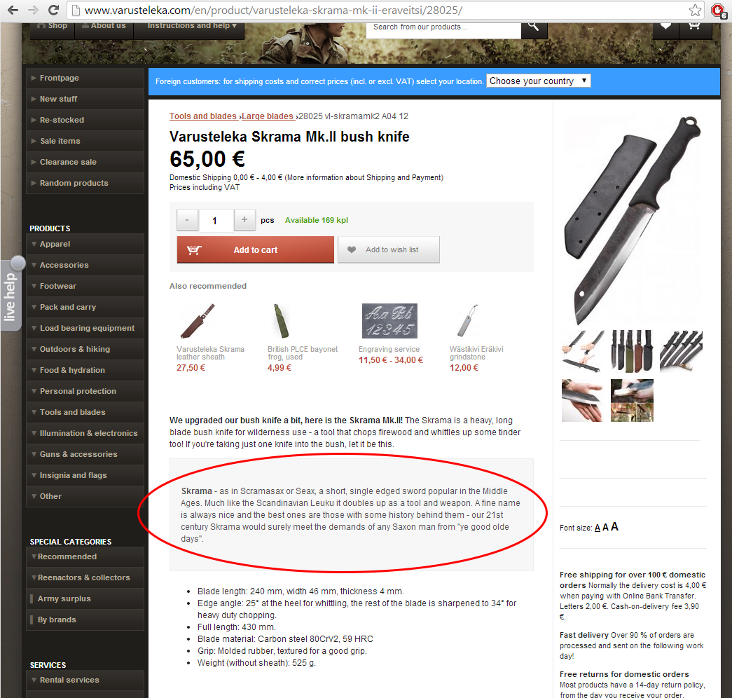 Varusteleka Skrama with leather scabbard. http://www.varusteleka.fi/fi/product/varusteleka-skrama-eraveitsi/24330 http://www.varusteleka.fi/fi/product/varusteleka-skrama-nahkatuppi/24331