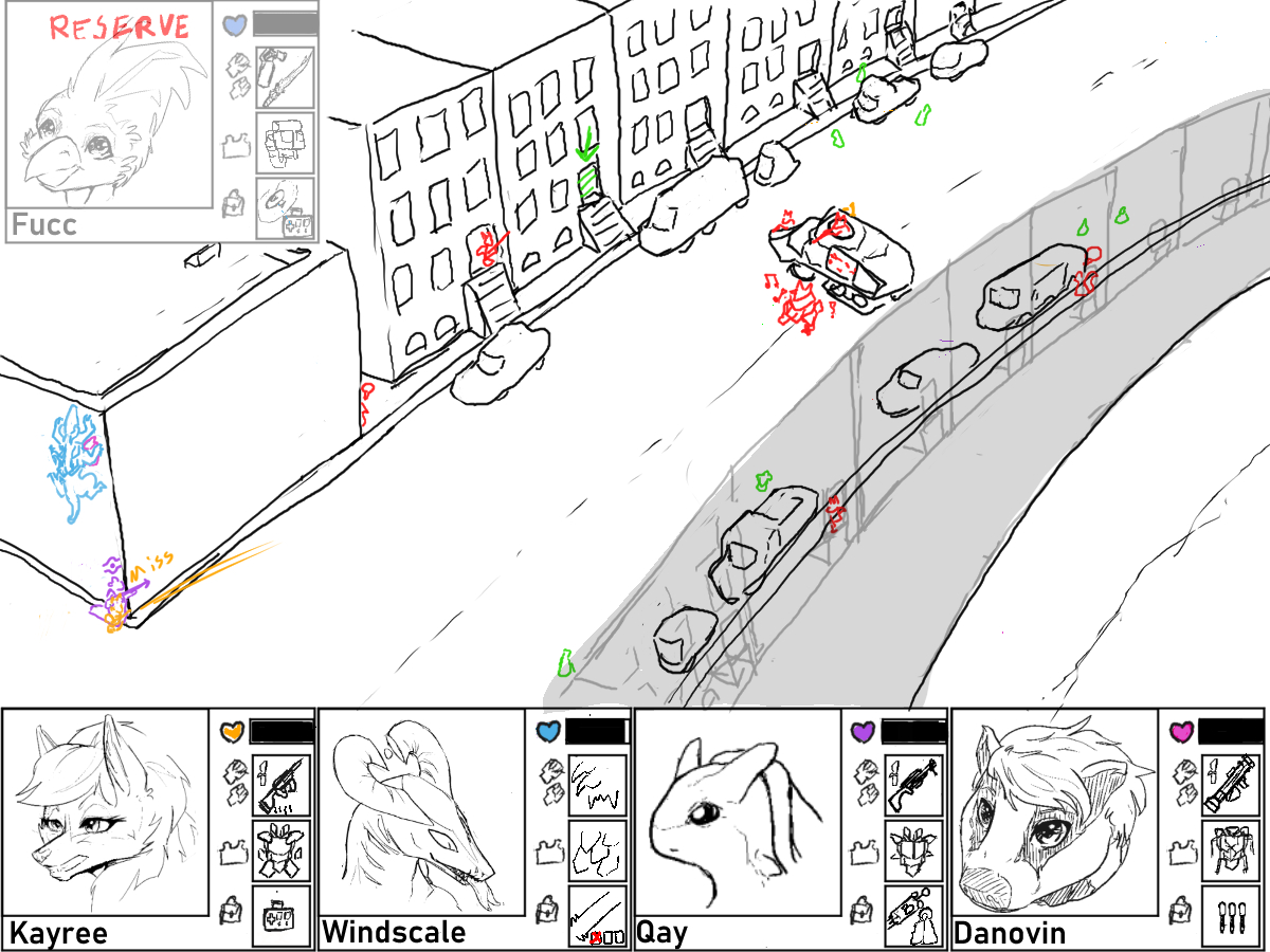 The turret gunner fires! She misses Qay and Kayree! Qay and Kayree take a penalty to Aim from the burst fire!