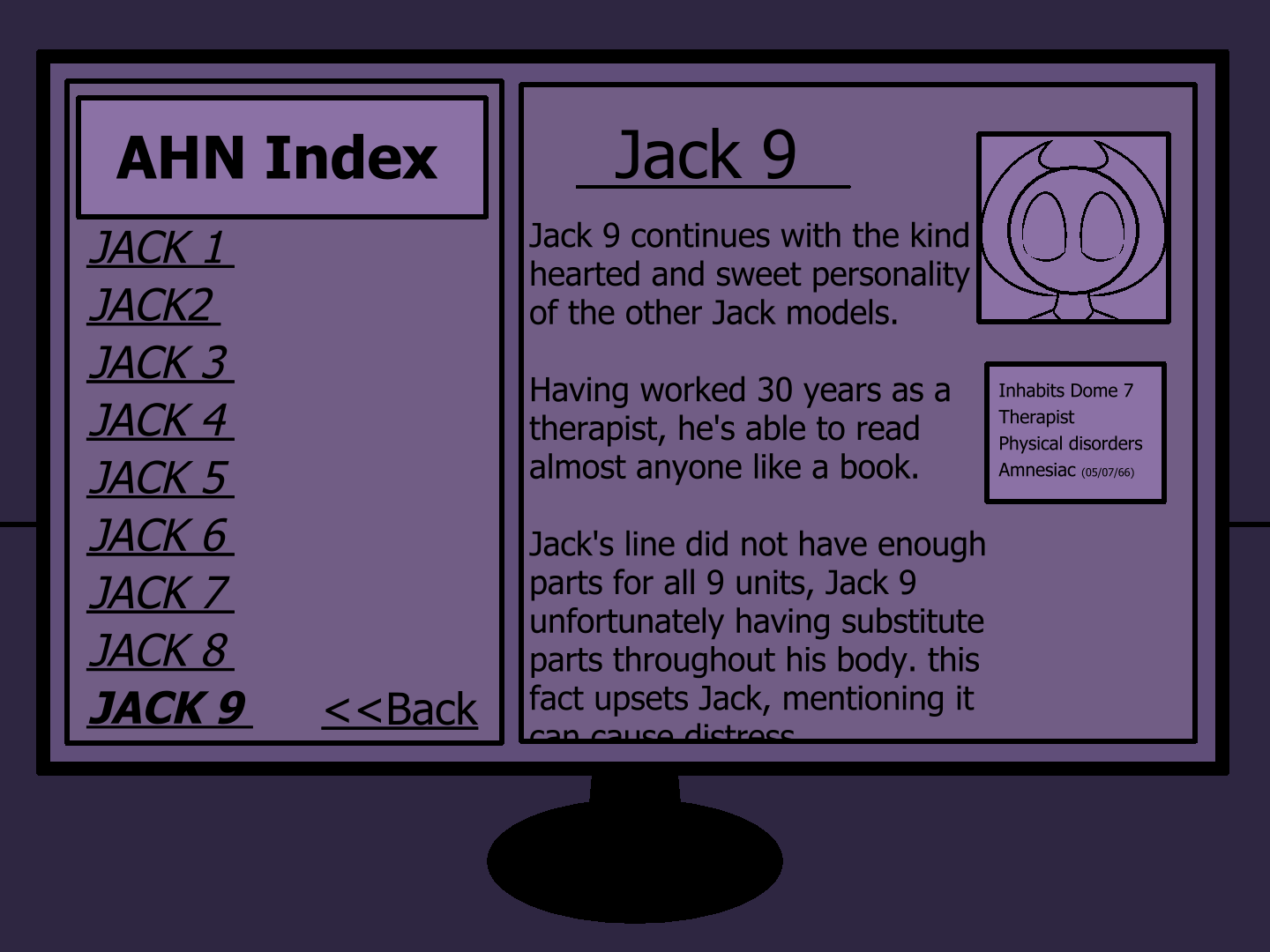 "Single planet, organic life outside the sectors and on other islands but we've isolated our societies to this island to preserve life. 9 sectors, each founded and ran by an AHN model. We're currently in sector 7. Ahn 1, 3, and 9 are dead... Well, 1 and 3 are confirmed, 9 has lost contact and is assumed dead but who knows, uhhhh... Society in each sector is a little different, but generally the same, bots are made, choose a job, work for their entire lives, die somehow. But take that with a grain of salt from me as I'm entirely biased with the idea of anarchy and freedom to do whatever."