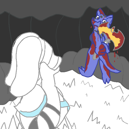 However, his prey is rudely interrupted and startled by Grey's sudden intrusion; Bardeibor turns his attention to her, clearly annoyed.