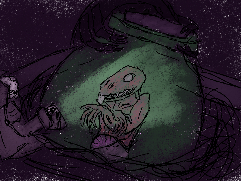 "Krrrr, that's not you, is it Gregor?" the deer mutters, clutching at its head. "You would never come in here without the chains good and taut." It huffs, a cloud of steam rolling from its jaws. "Then it must be one of the scurriers. I've heard you up above you know. You, er, whatwasit? -mice. Yes, mice. Finally come down to see old... old..." another spark and a wince "old me, eh?"