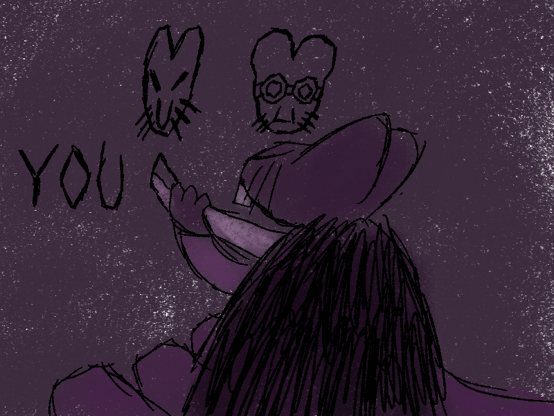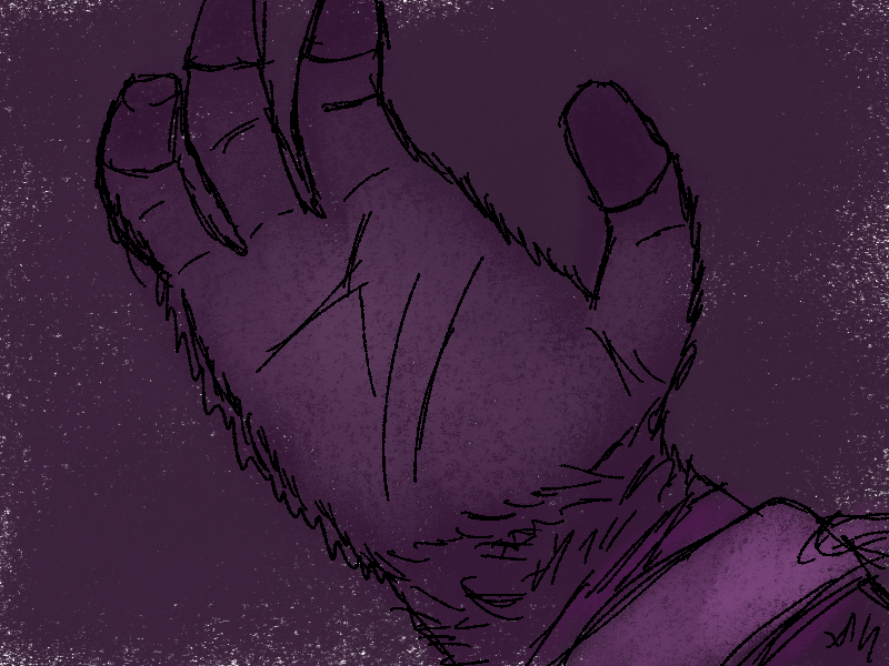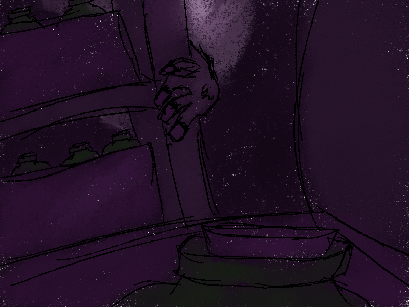 Hoarse breaths waft steam around the corner. A hand many times your size grasps the edge of the rack. Fingers that end in blunt nails scrape the wood. "Theeeeeeeives?" the thing rasps.