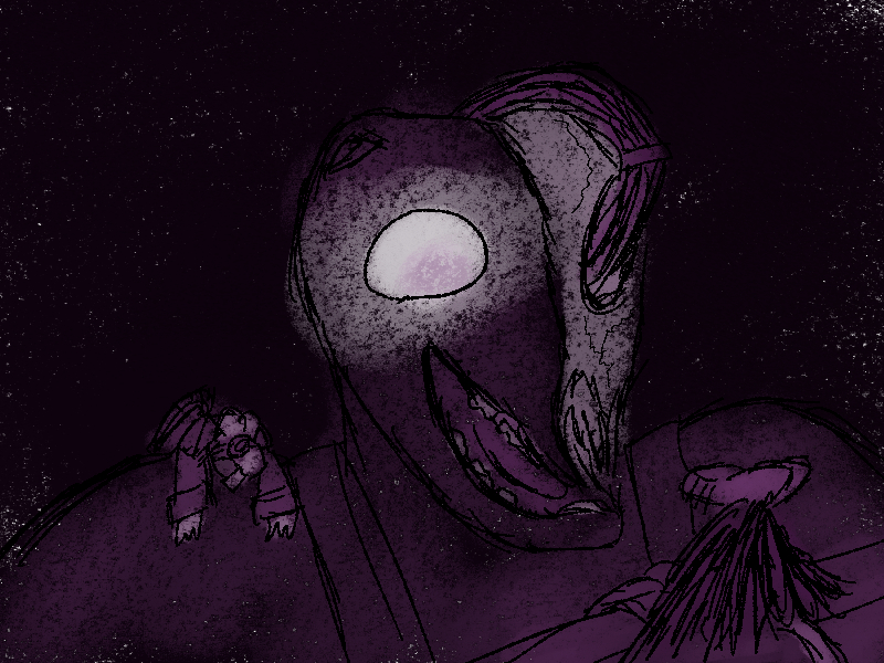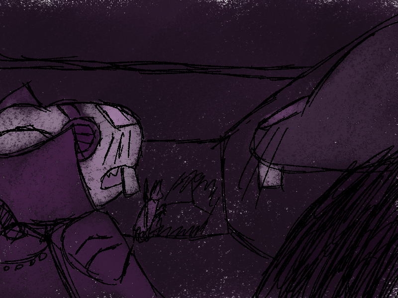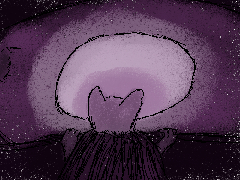 You hear something patter onto the ground behind you. Looking around you see a few drops of blood on the ground. Sorrel is standing very still, staring ahead. One hand is clutched over her face, her long fingers dragging gouges through her fur. Blood trickles down from the rents.