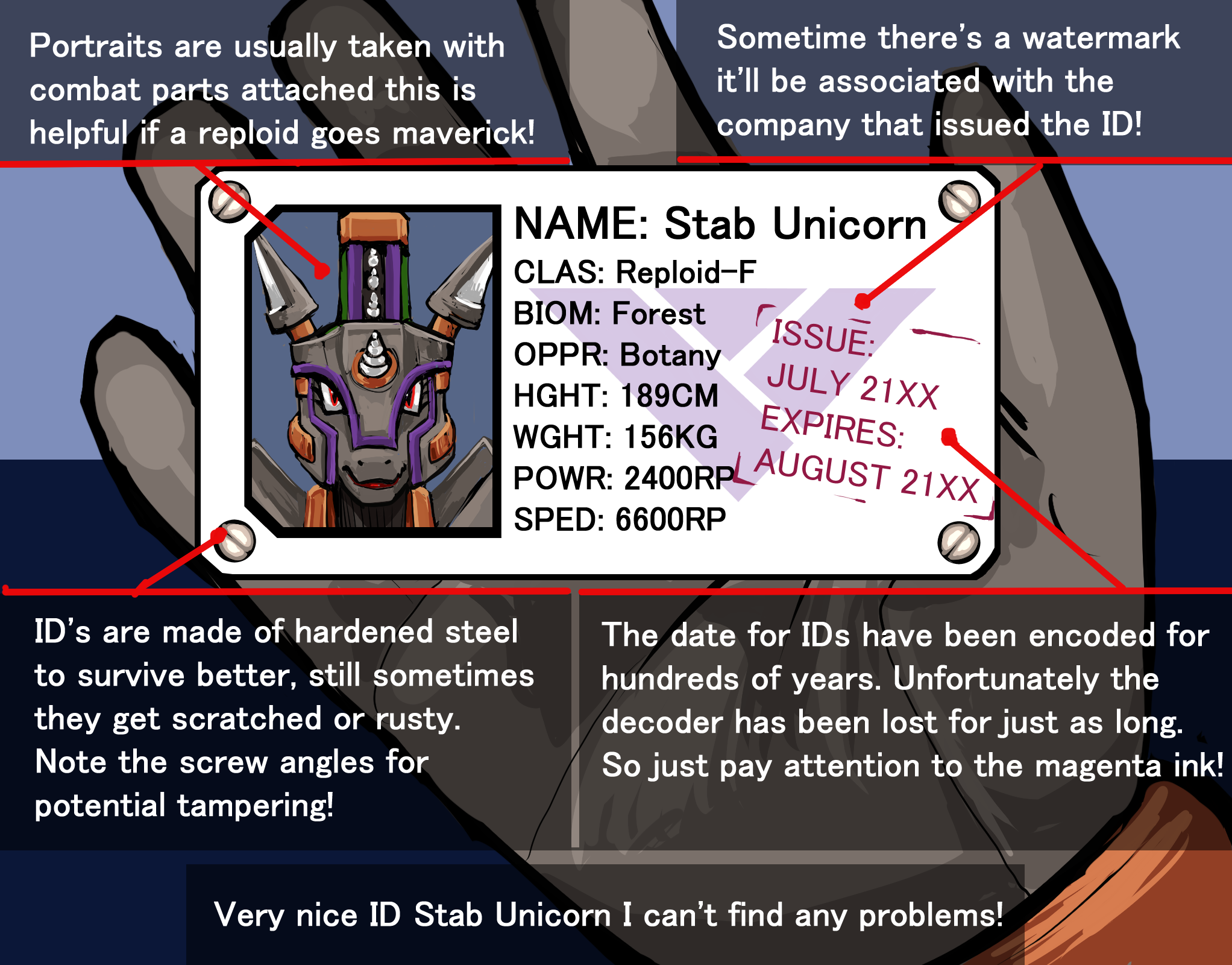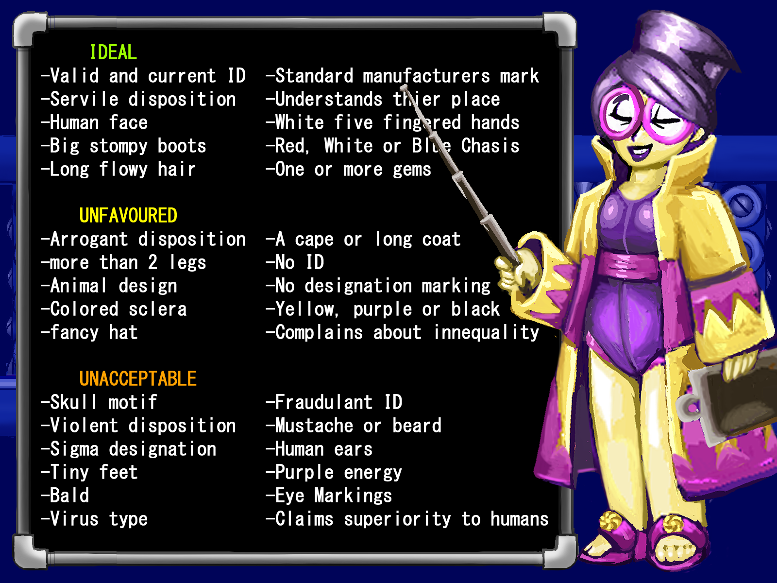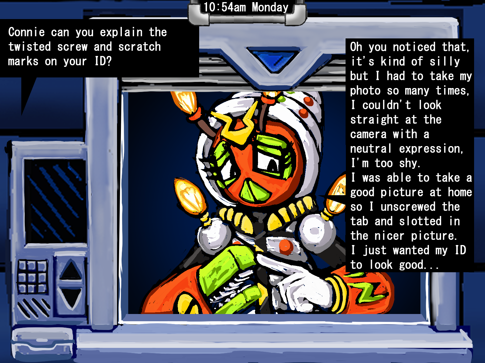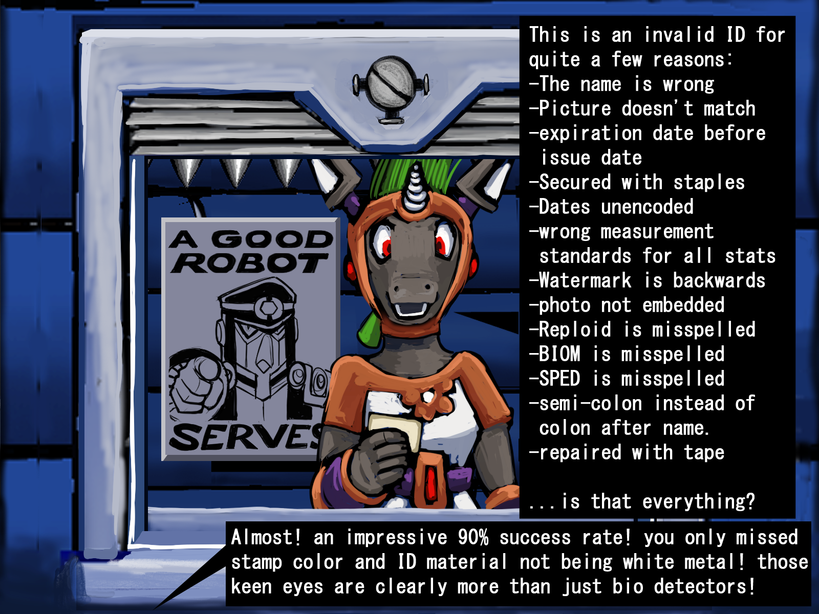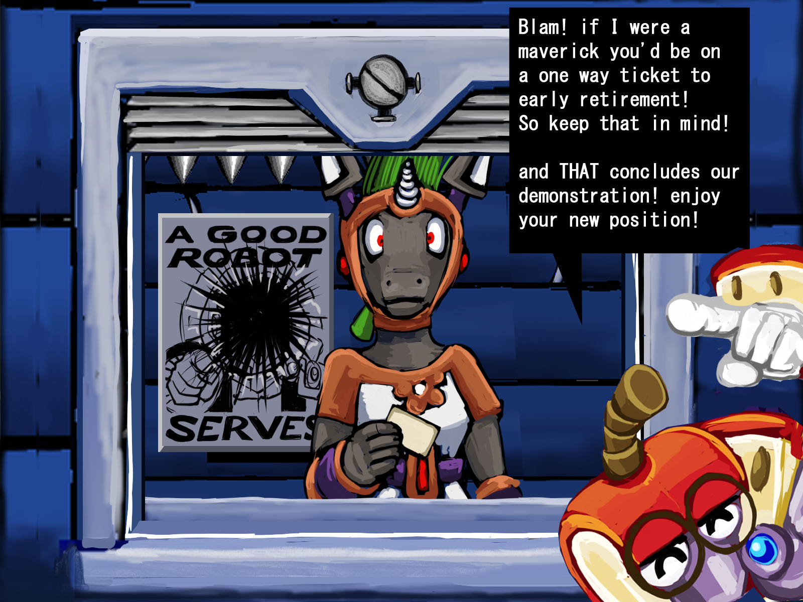 Well, this day just got a whole lot brighter (and shinier)! Not only is the next entrant another reploid, but she's the famous Gilded Goose here to meet us in person! Or an impostor trying to exploit her fame to bluff her way past security. A Maverick Hunter can't afford to let her admiration get in the way of investigating a potential Maverick.
