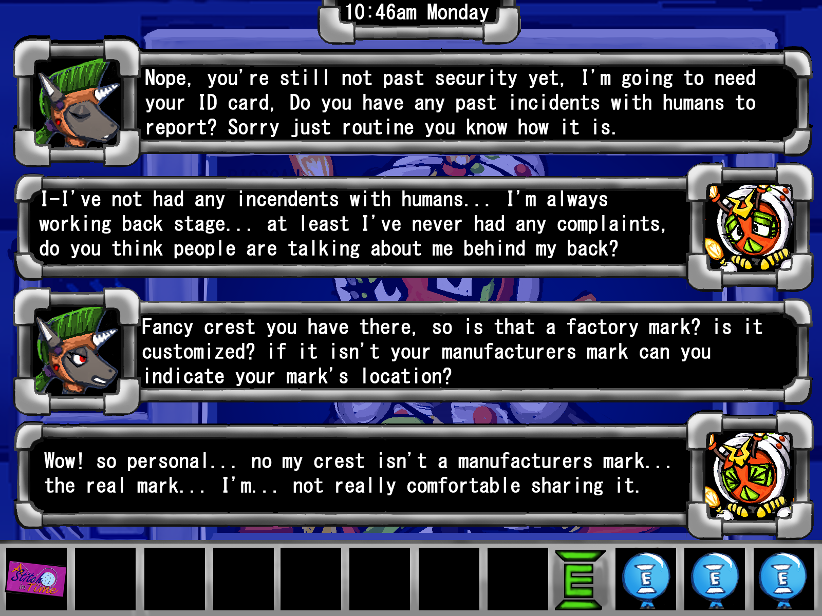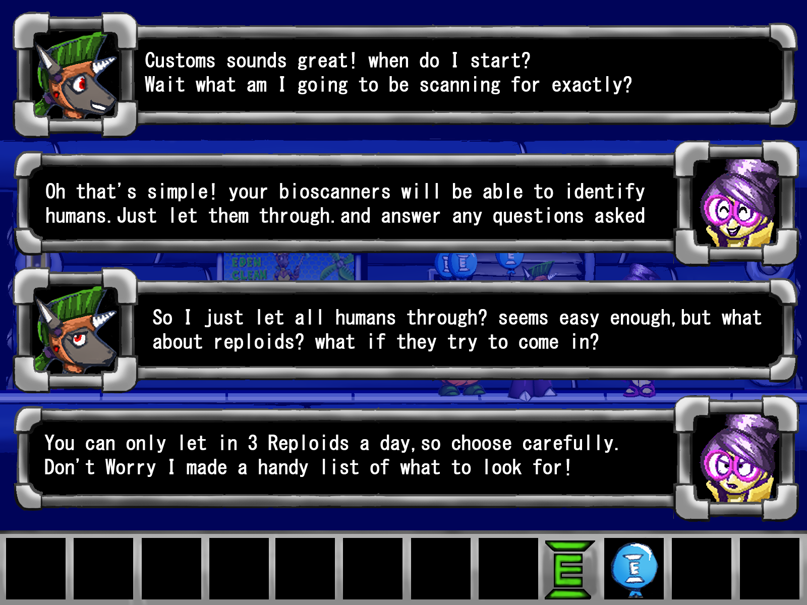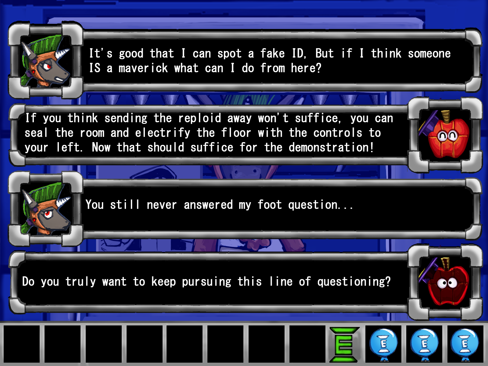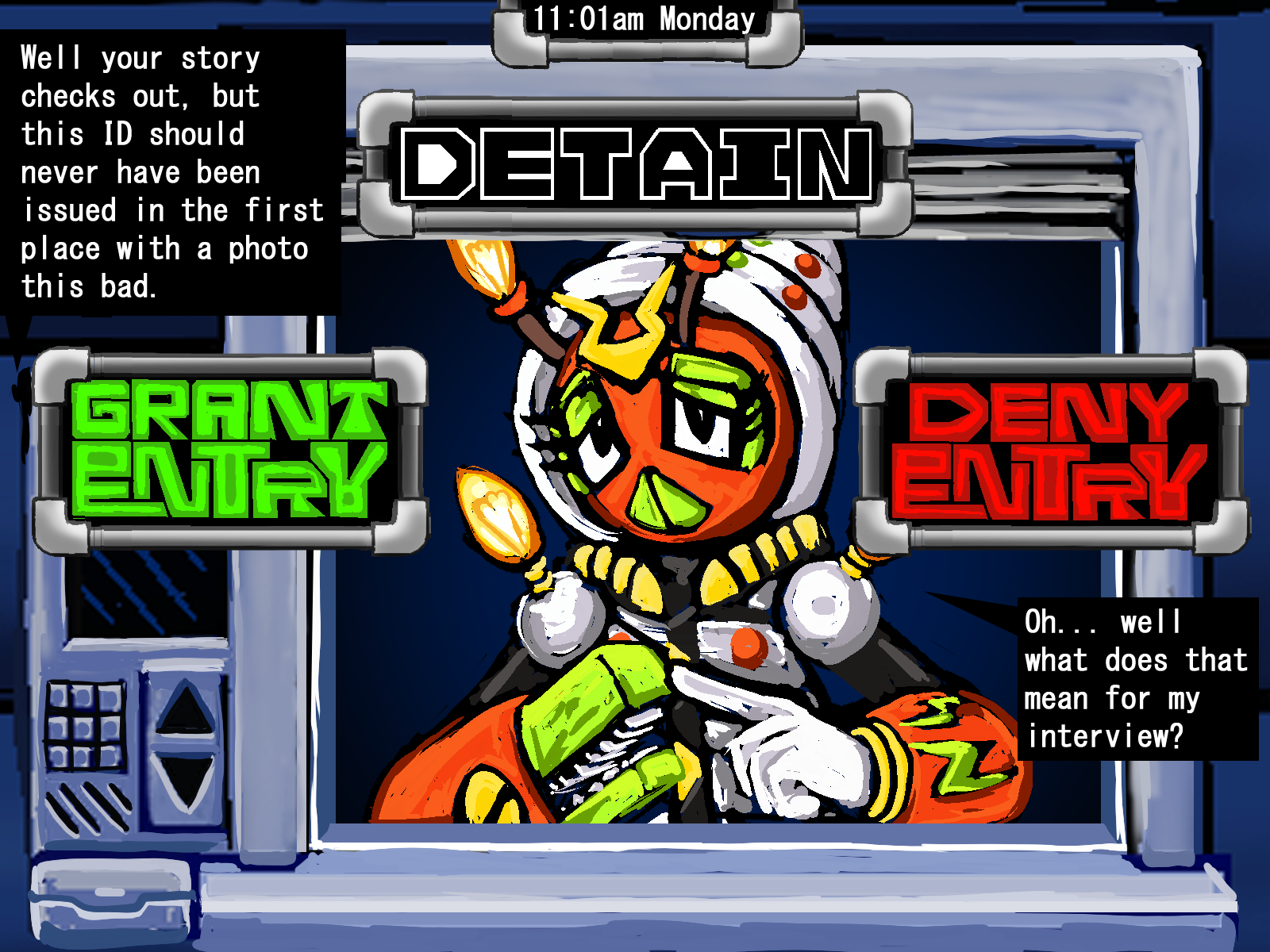 Well, this day just got a whole lot brighter (and shinier)! Not only is the next entrant another reploid, but she's the famous Gilded Goose here to meet us in person! Or an impostor trying to exploit her fame to bluff her way past security. A Maverick Hunter can't afford to let her admiration get in the way of investigating a potential Maverick.