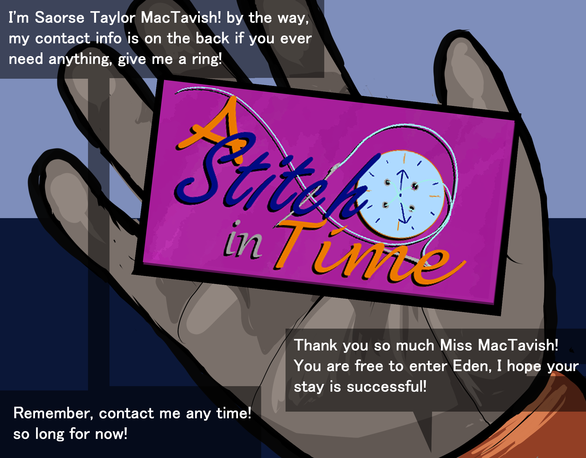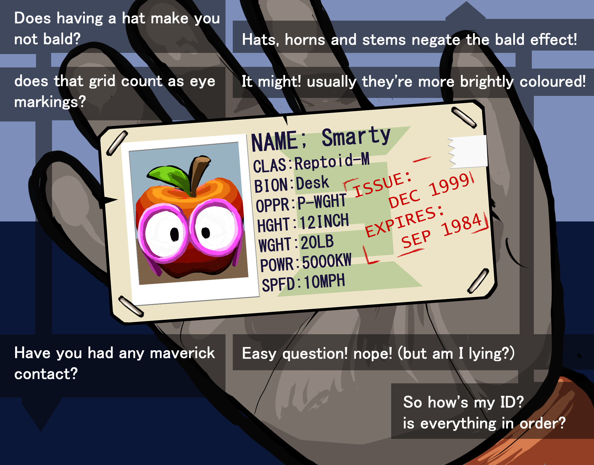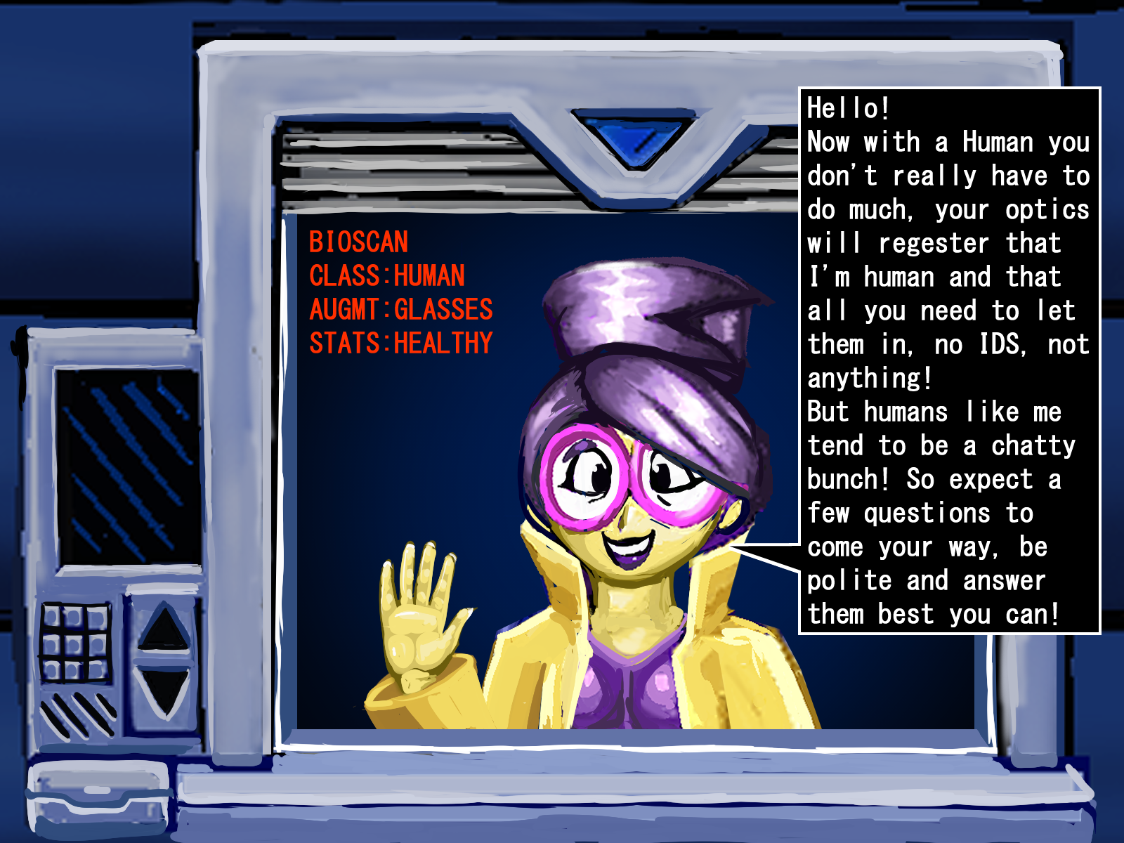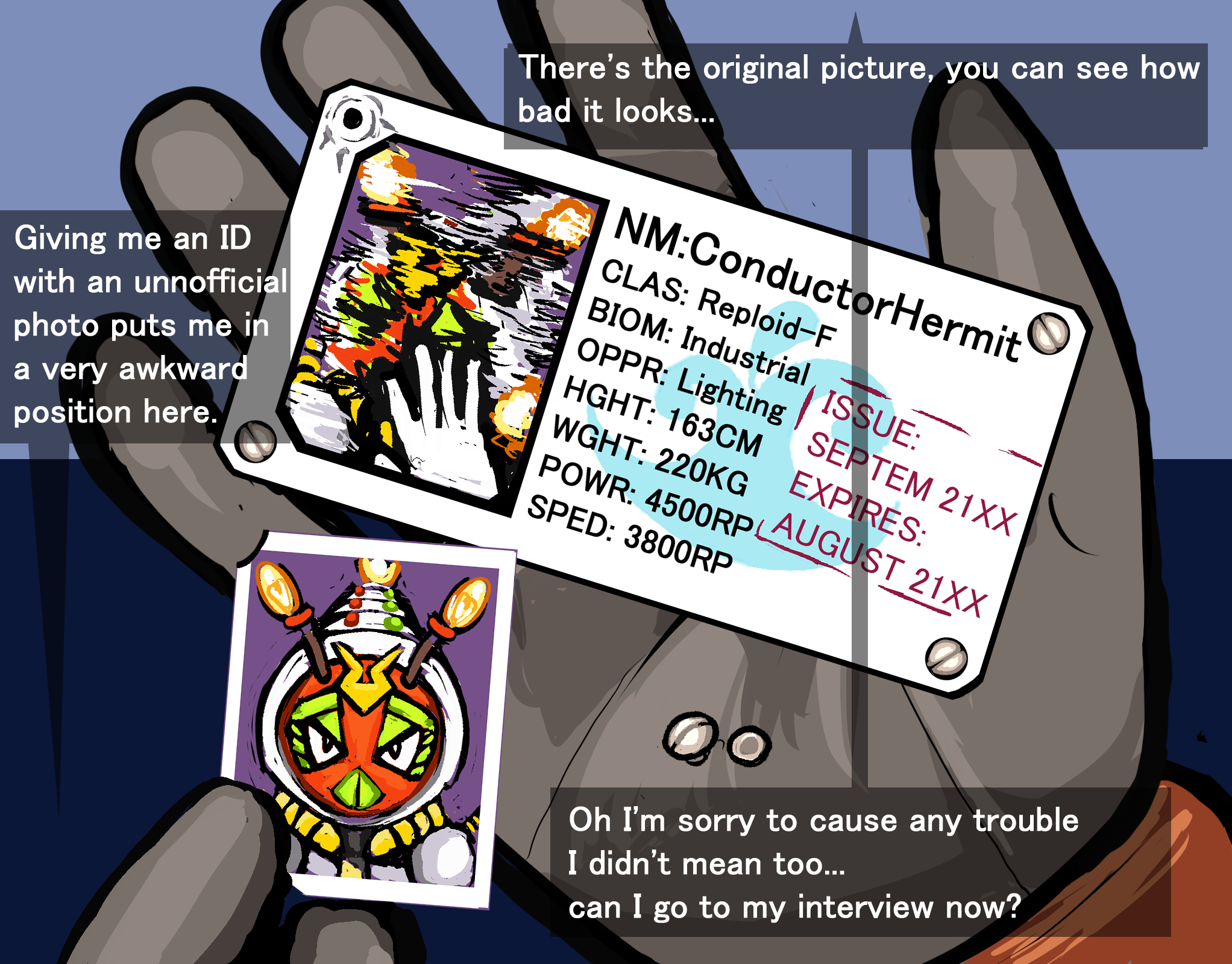 "Thank you! My name's Stabitha, and I know who you are. Big fan of your work! What was that about your ID and room number? I'm the border guard, it's my job to collect ID cards and inspect them, and I haven't received any in advance."