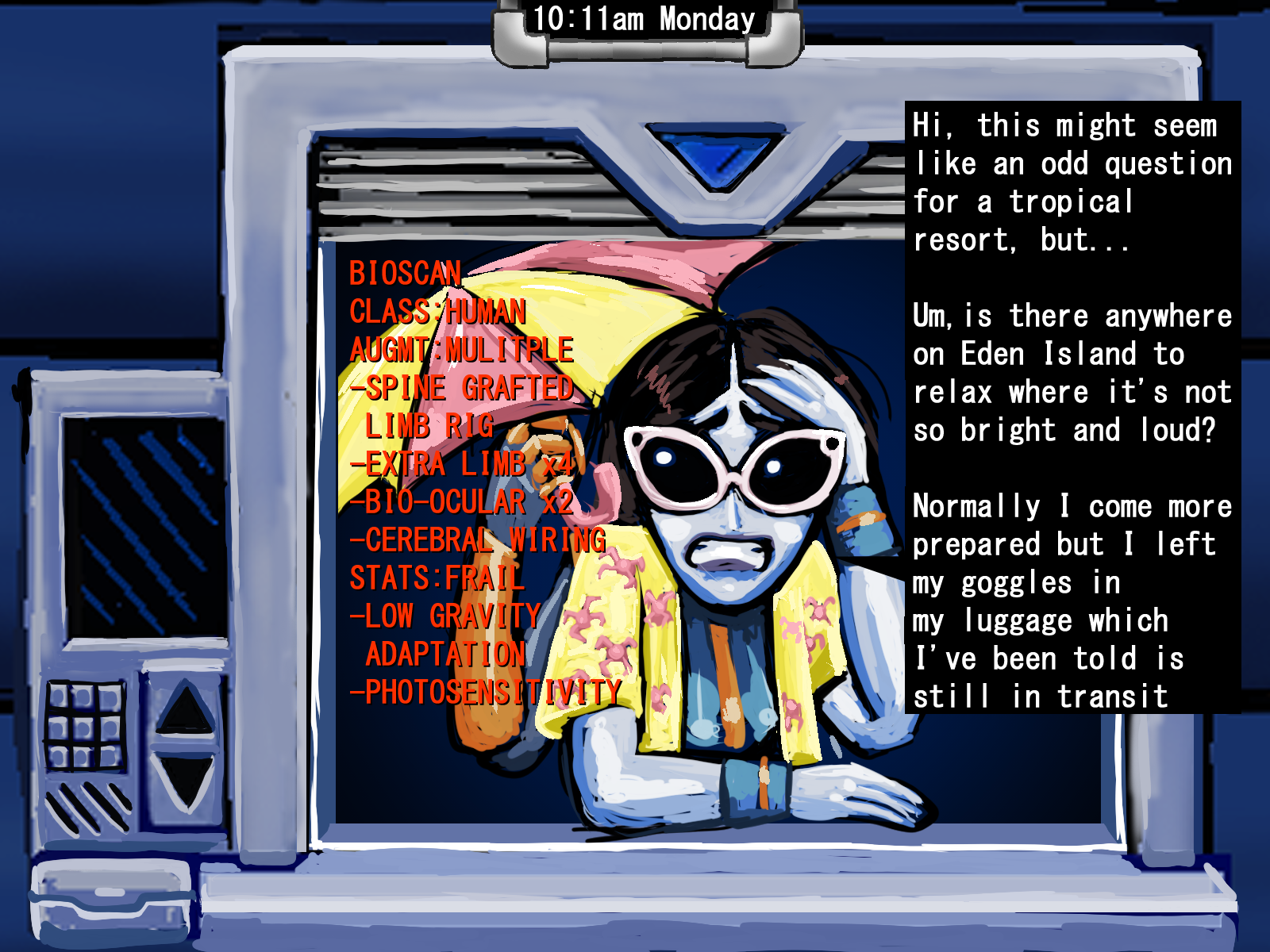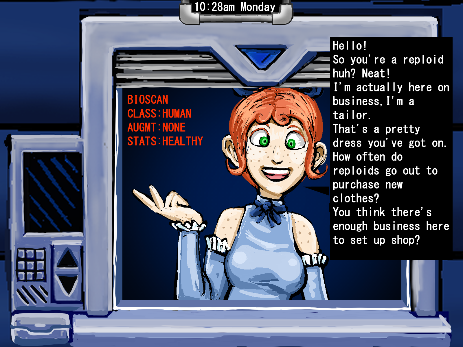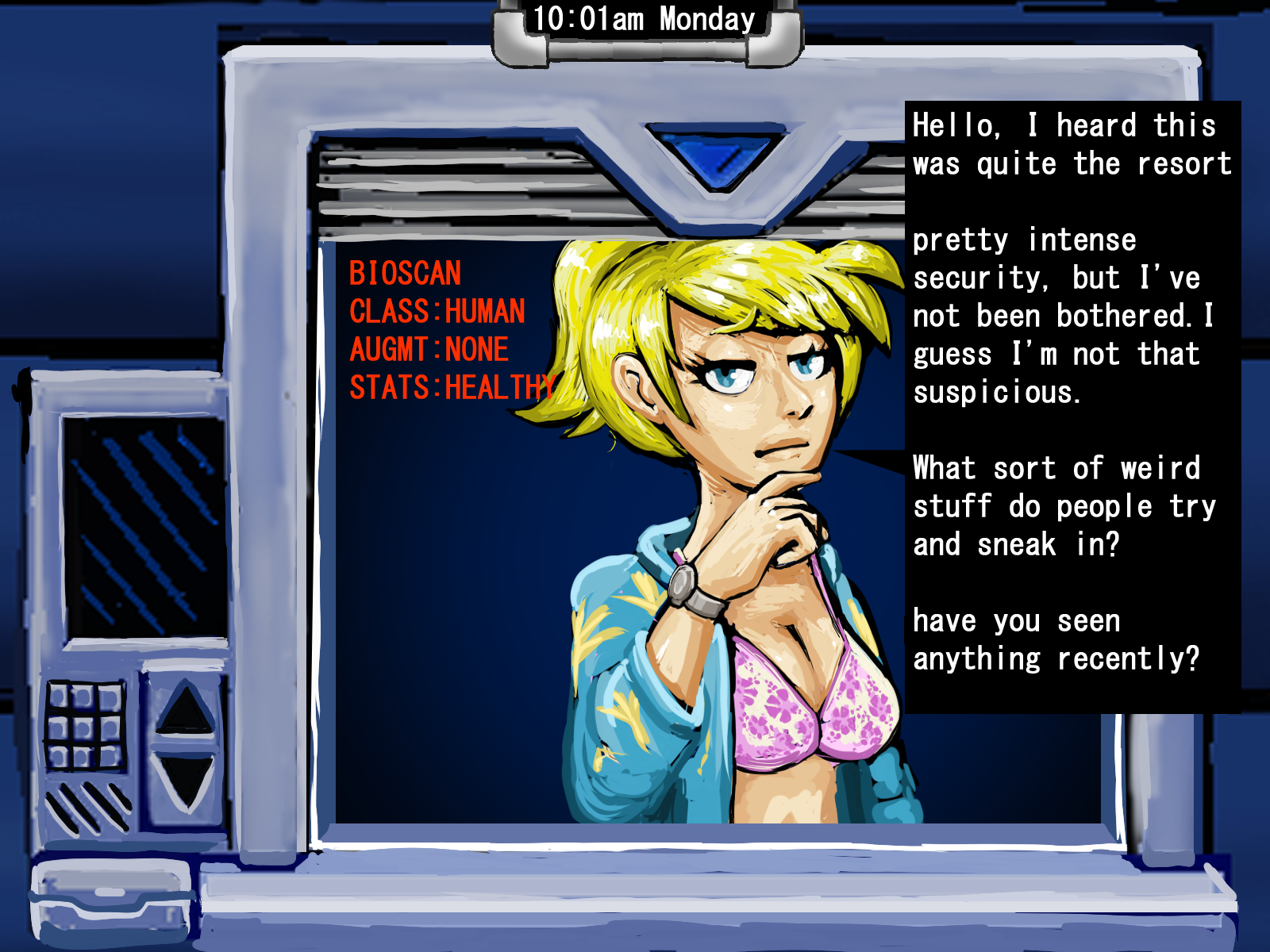 "Thank you! My name's Stabitha, and I know who you are. Big fan of your work! What was that about your ID and room number? I'm the border guard, it's my job to collect ID cards and inspect them, and I haven't received any in advance."