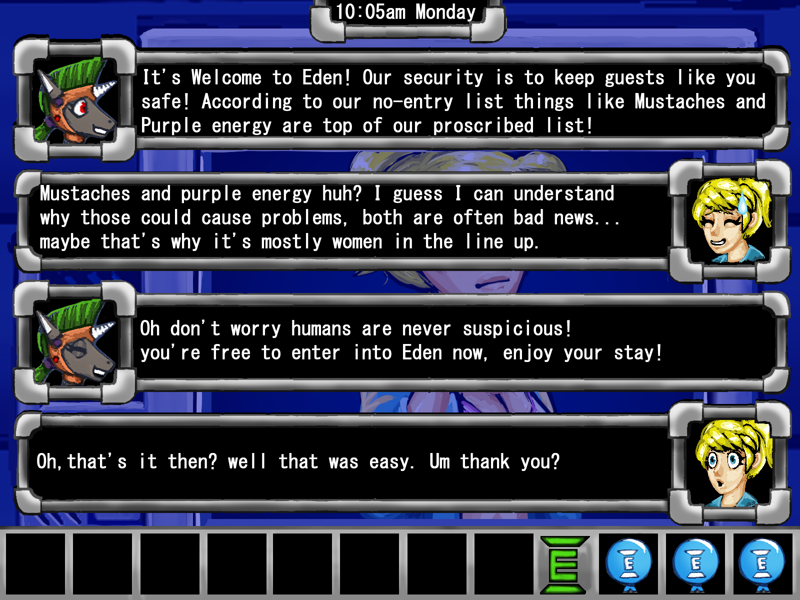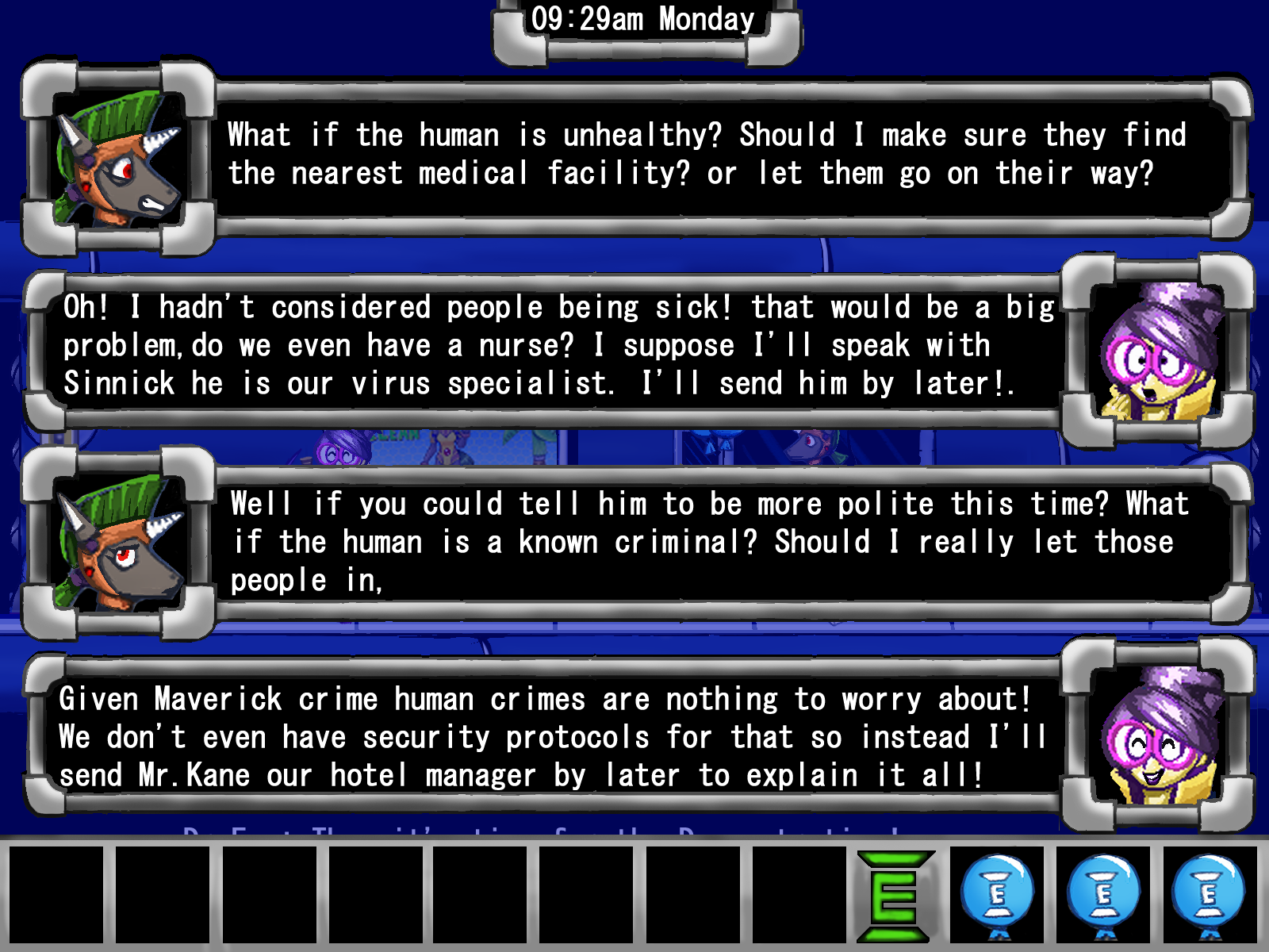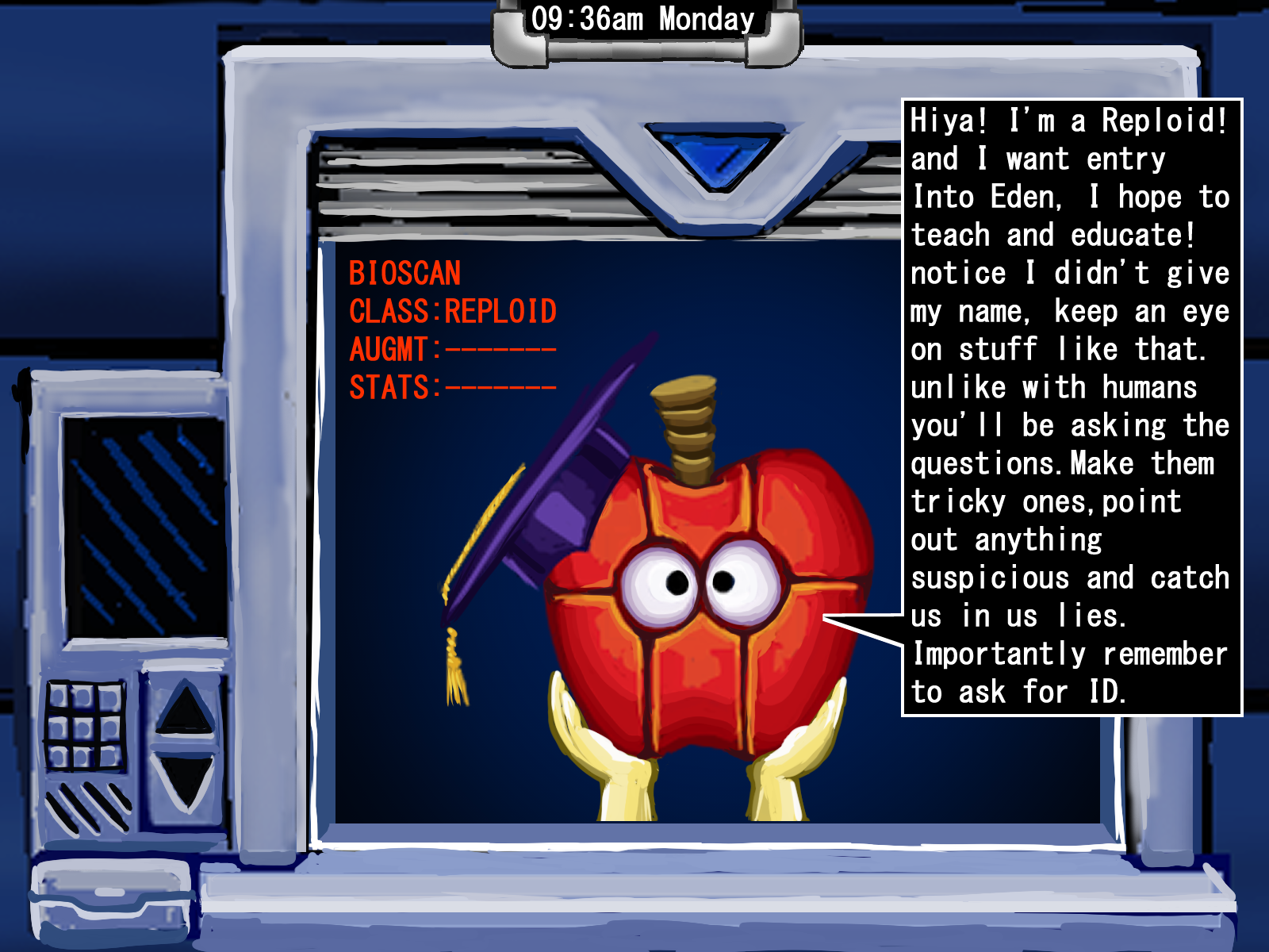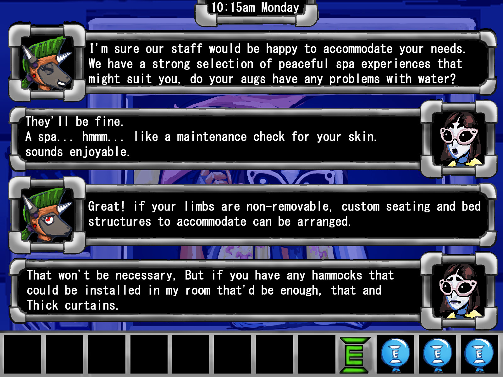 "Thank you! My name's Stabitha, and I know who you are. Big fan of your work! What was that about your ID and room number? I'm the border guard, it's my job to collect ID cards and inspect them, and I haven't received any in advance."