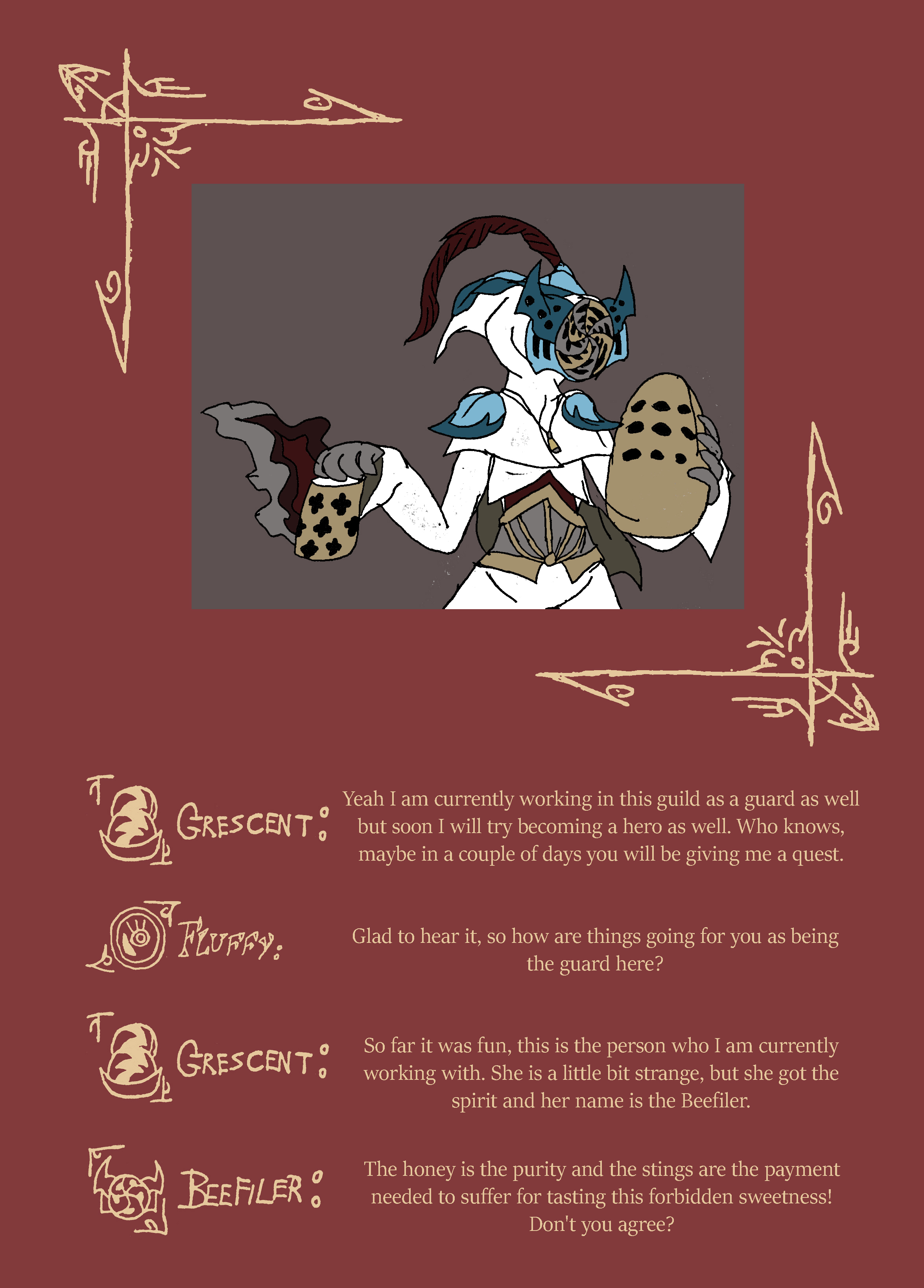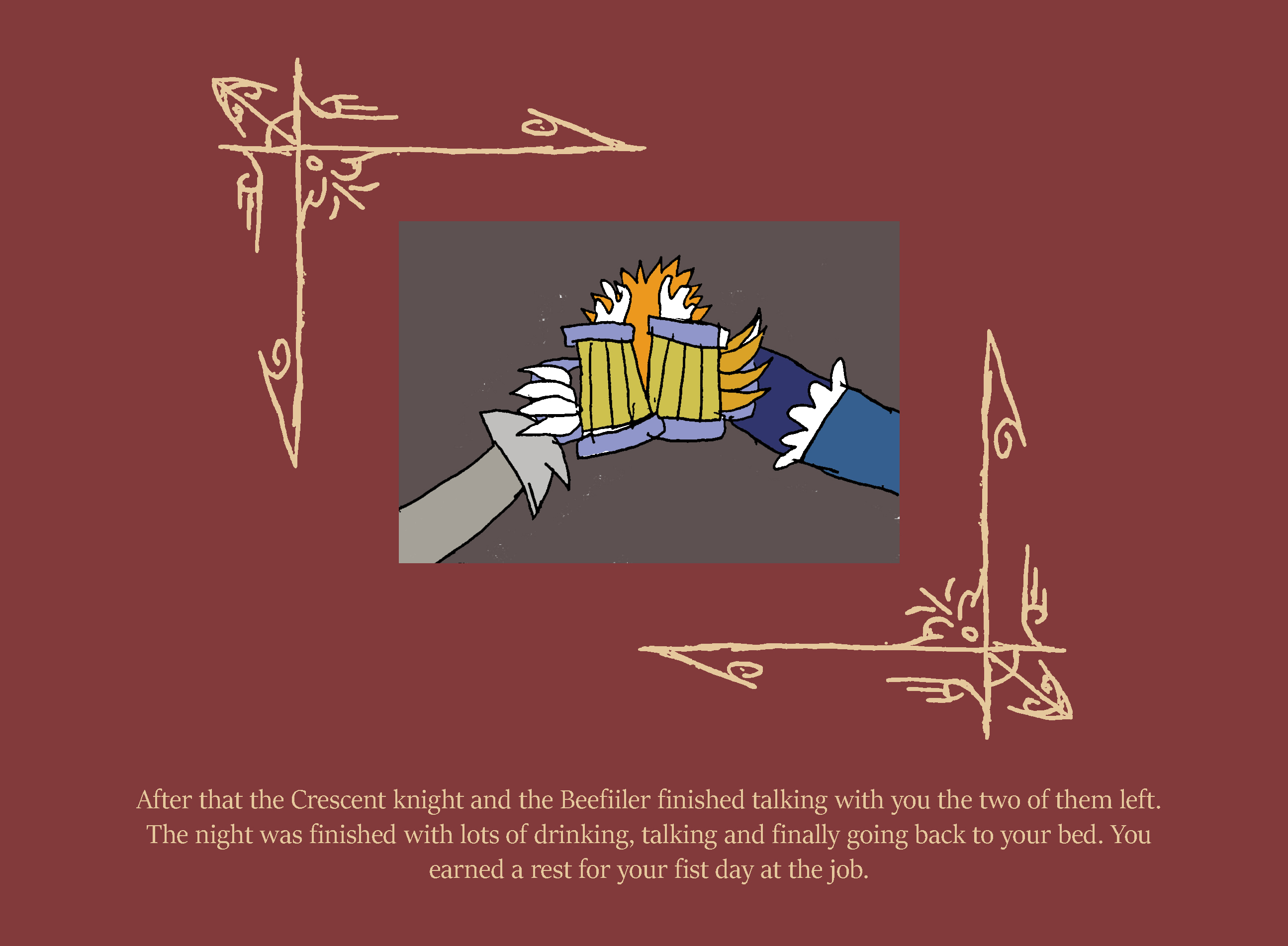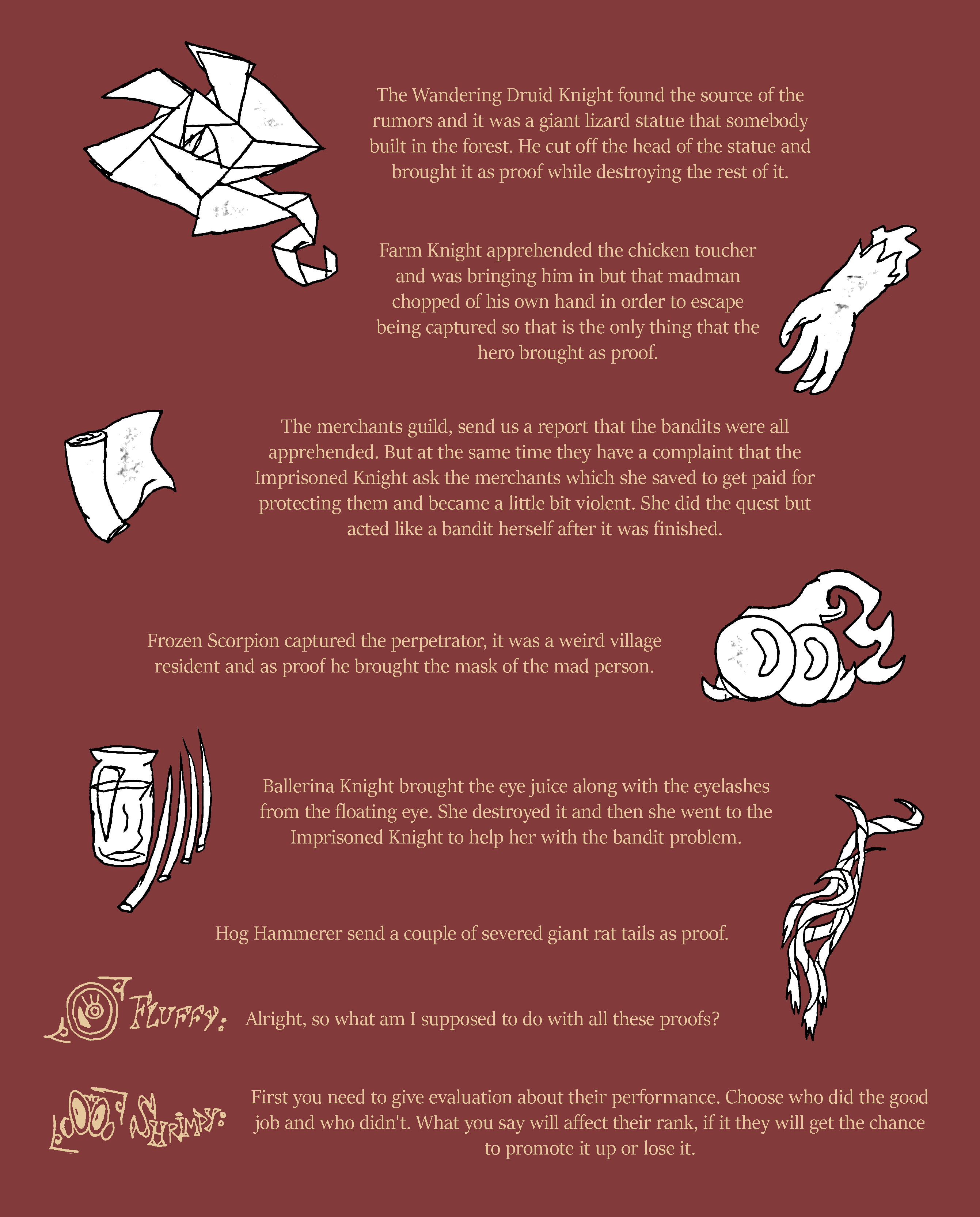 Ballerina Knight: excellent job. Though I wonder, what was her side of the story with what happened with the imprisoned knight and the merchants? She probably witnessed all that. Also, did she find out why that eye was observing the village? I suggest giving her bonus pay for taking care of both jobs.