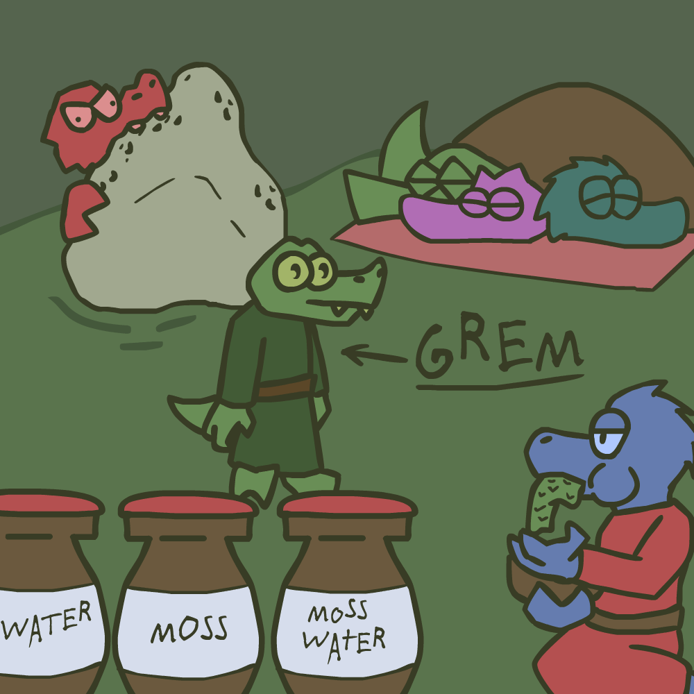 Grem got great idea! Eat moss and drink moss water until Grem is biggest kobold! Than Grem can be moss king and make other kobold pay for moss! Grem so smart!