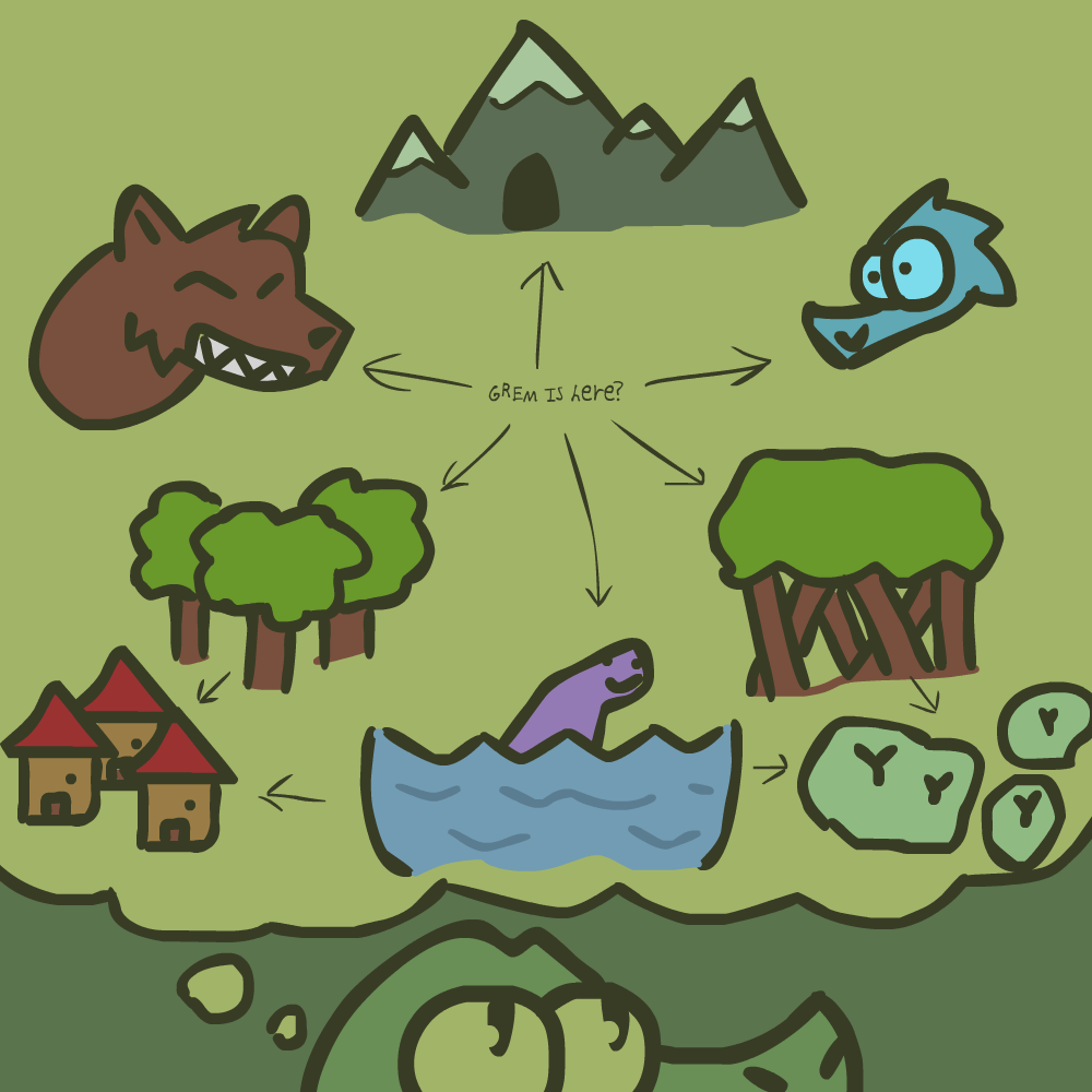 And orb! Do not forget orb to ponder. Grem already have animal friend. Their name is Rock. They are Rock. Rock is Grem’s bestes friend in the whole world. Now, where will Grem find big stick staff, big hat and shiny orb?