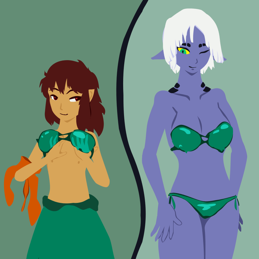 Stargazer flails in panic, not sure what to do with her weird bony arms in this sort of topless situation. This is terrible! Stargazer let her guard down and forgot that Alkaline is EVIL! Now she has half of the swimsuit that Reisarf has been looking at so much tonight, and who knows what evil things she'll do with it?!