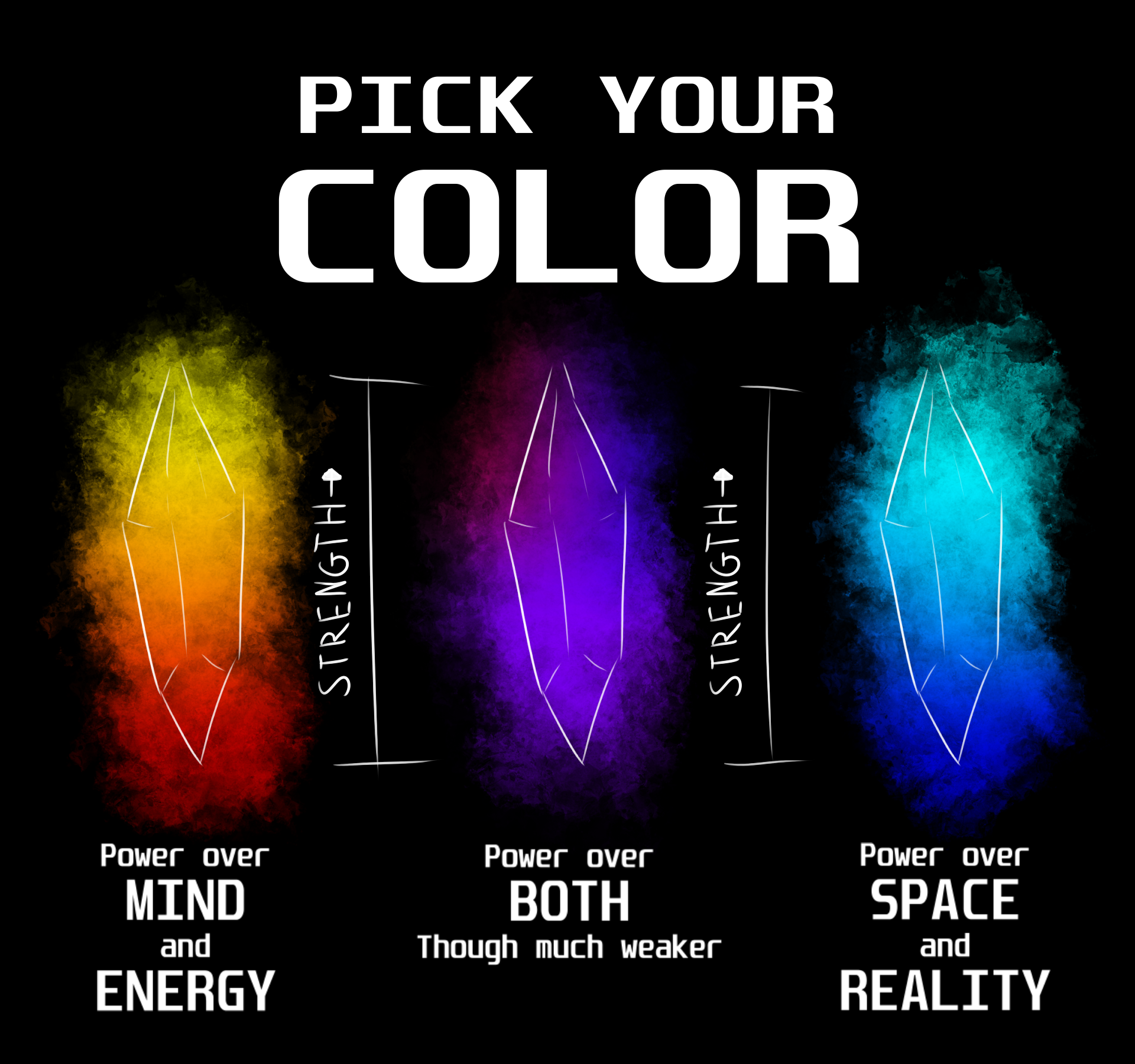 The purple gem is a trap. We crave power. Jacks of all trades are incapable of devoting themselves to one core strength, and utilizing that strength well. Being a Jack of all trades has its advantages, but a weak strength is a weakness when you crave power. Better to discard one over the other. My preference is Space and Reality. If we can shape the world as we see fit, who cares what the minds of others may seek to do about it~