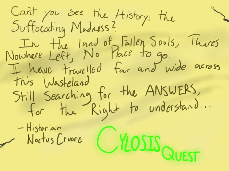 Developing some lore here. This intro has four posts to it. Please keep suggestions until prompted. They say that this place is haunted. Here, where the air carries the shrieks of grotesque, alien beasts, and where the nights are of unforgiving coldness. I call my subordinate, Lur. It is important for him to see what I have seen. This place is haunted. This is what I have been told by rogues and outcasts. Worthless traitors, rotting in their rusting, filthy cages. Prisoners. I had never believed a single word of it. I had beaten them for their idiocy. They say that the spirits of the dead; victims of this brutal wasteland, had carried themselves with some apparent purposelessness, screaming the songs of their death. Hopeless, lost souls. But today... I have seen it for myself. No 'lost soul,' wandering aimlessly, but something worse. For today...