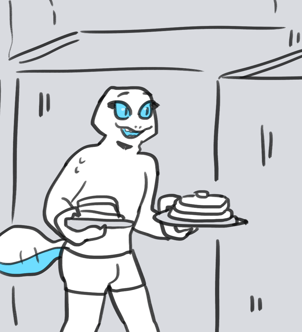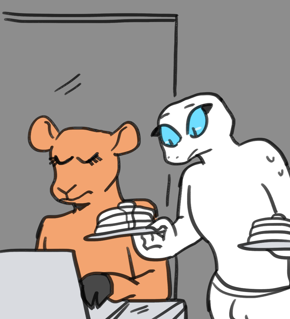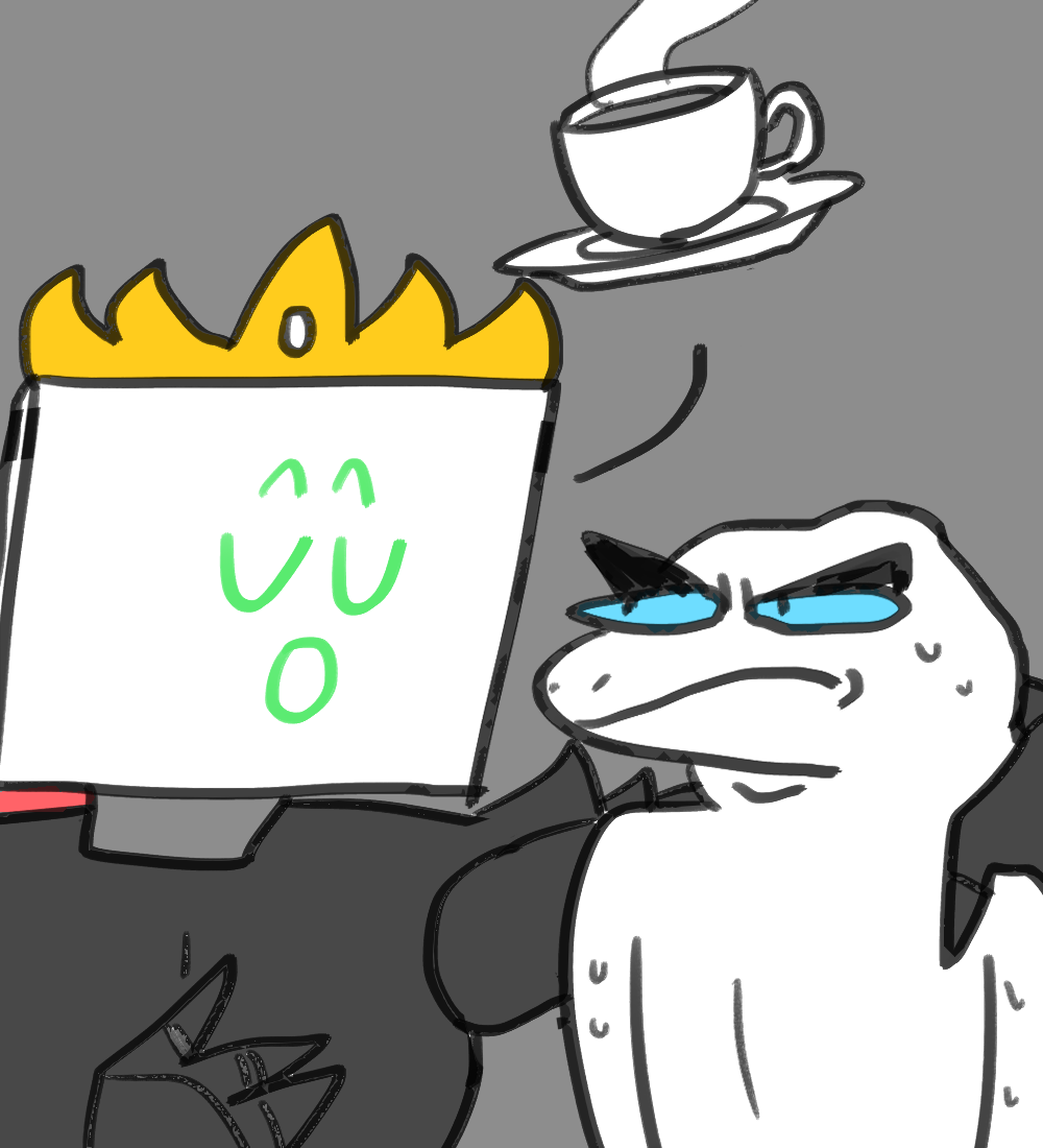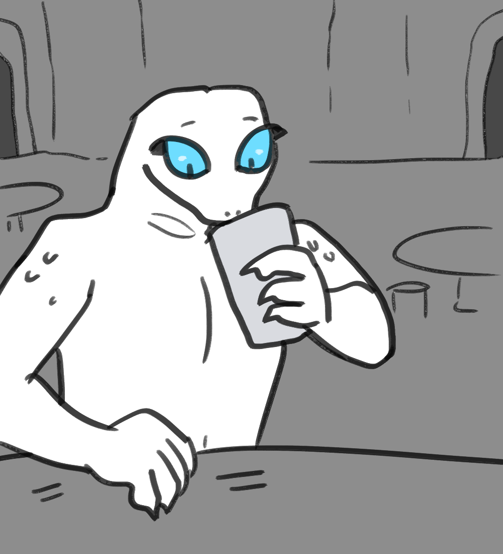 The robot fetches a mug of coffee for the shrimp, who sips from it in silence. The robot continues to stand there for a while.