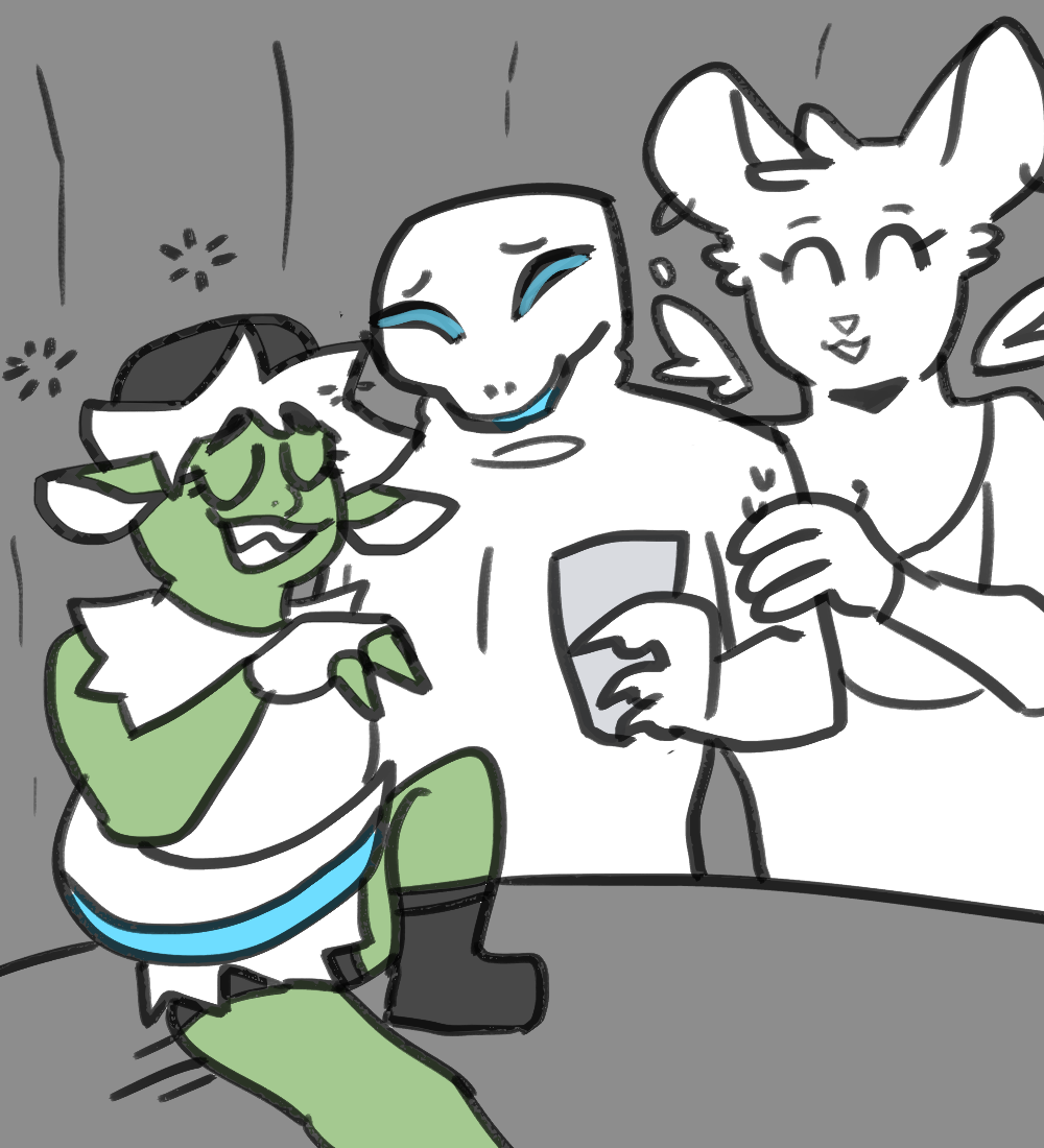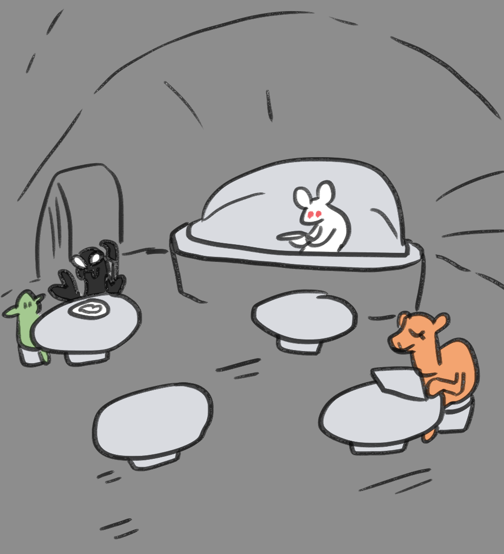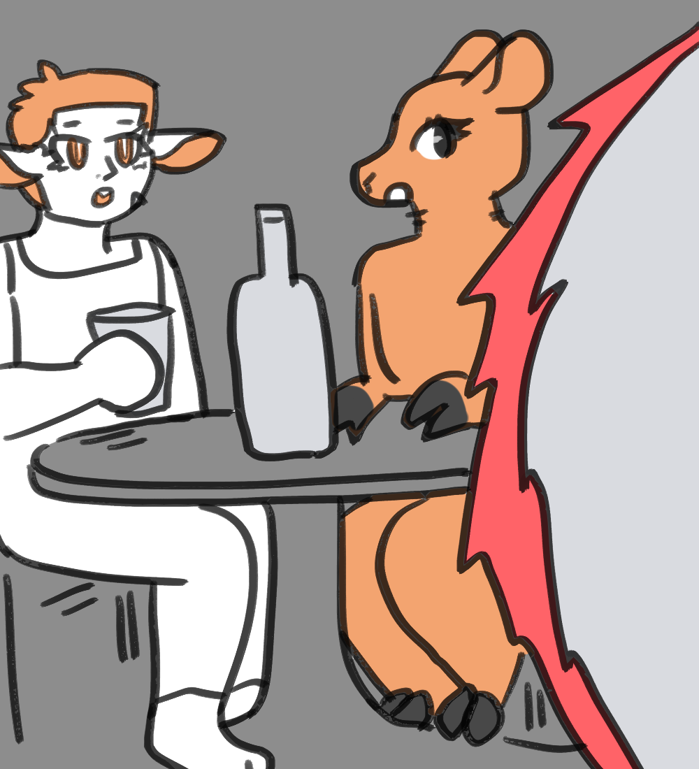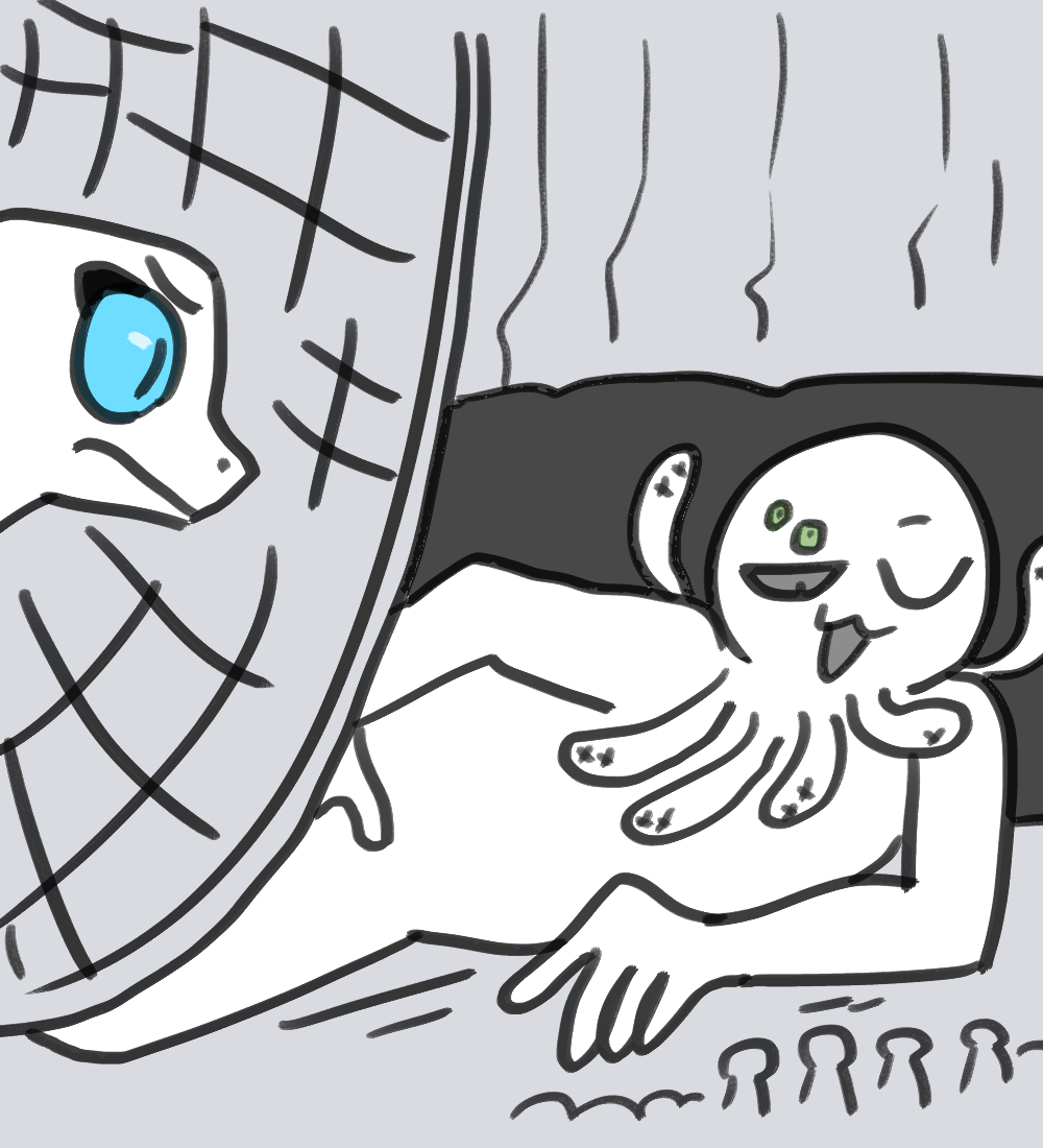 The robot fetches a mug of coffee for the shrimp, who sips from it in silence. The robot continues to stand there for a while.