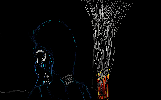 She points. "FIRE! It is burning! It dances with her! Inside!"
