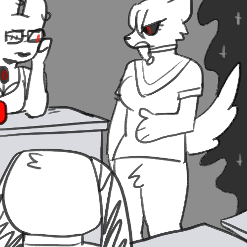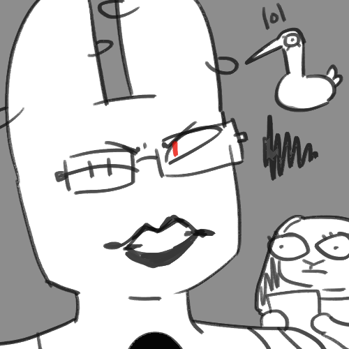 After a few minutes, you hear the door open and the clack of heels as the 5th grade teacher, Mizz Es, steps out. You’re only in 4th, but you recognize the tall woman by her sharp clothes, missing eye, and wireframe glasses.