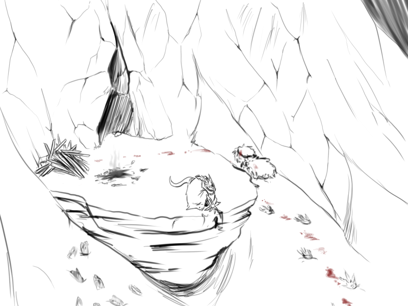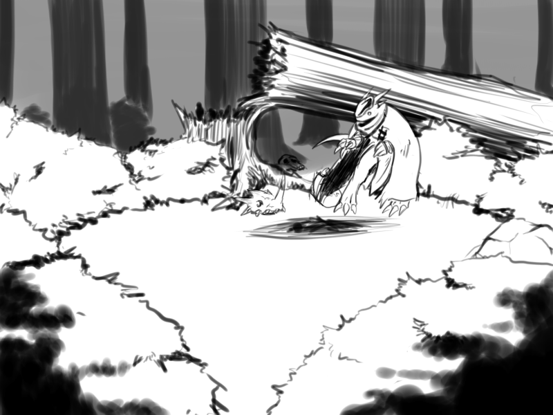 As I return to the clearing I discovered the two creatures, I briefly inspect the objects they deposited at the base of the downed tree. It appears to be a pair of odd skulls and an assortment of various bones. Most likely from two separate creatures, given the diversity in the bones' appearances, and the lack of complete skeletal anatomy. I then follow in the direction I observed the two figures skulking off in.