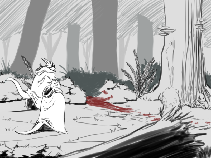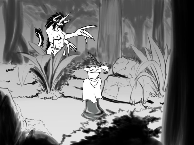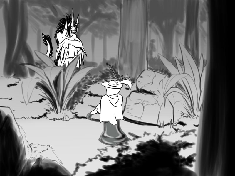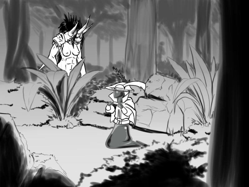I retreat back to the clearing temporarily and inform Shyen of what I over heard. I ask her to return to the village and warn the human soldiers and her towns people of the impending danger. I then slink off back into the brush.