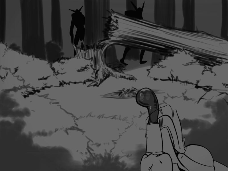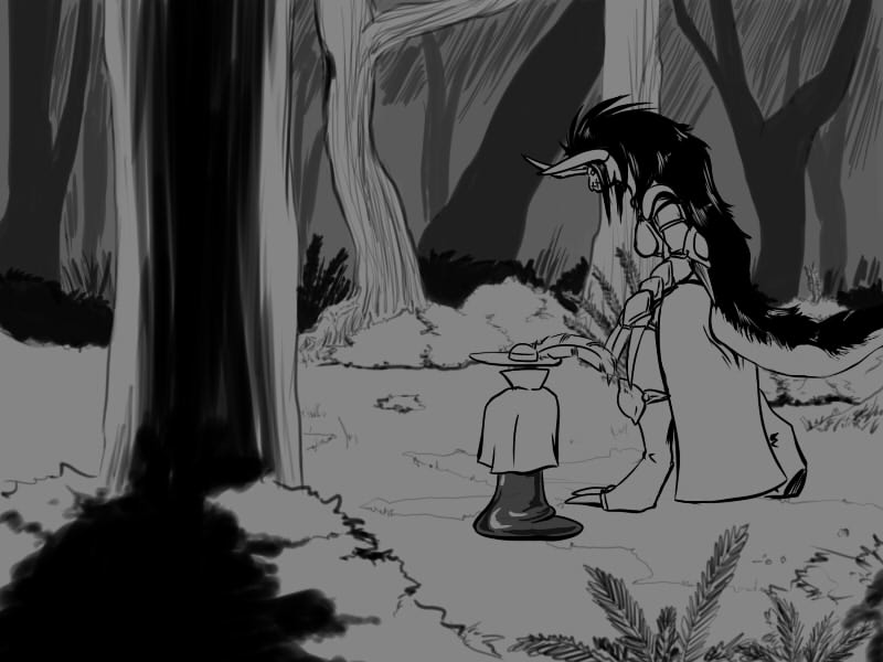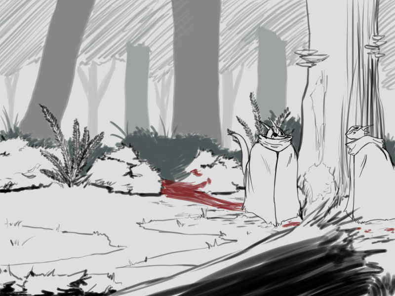 The two of them stand up, one kicks out the fire before I can get a good look at them, and the other deposits a pile what looks like bones by the roots of a downed tree. The begin skulking off into the woods. Should I pursue them now, warn the village, or go get Shyen? I can't decide what to do!