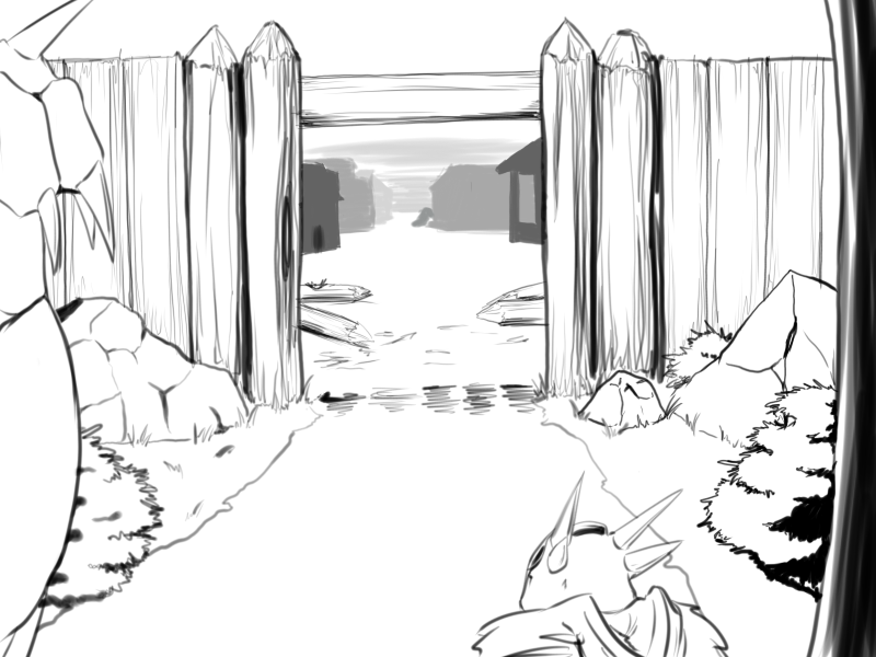 I arrive at one of the village's side gates and they let me in. I rush through the opening as it begins to close behind me. Shyen is standing in the road with one of the humans.