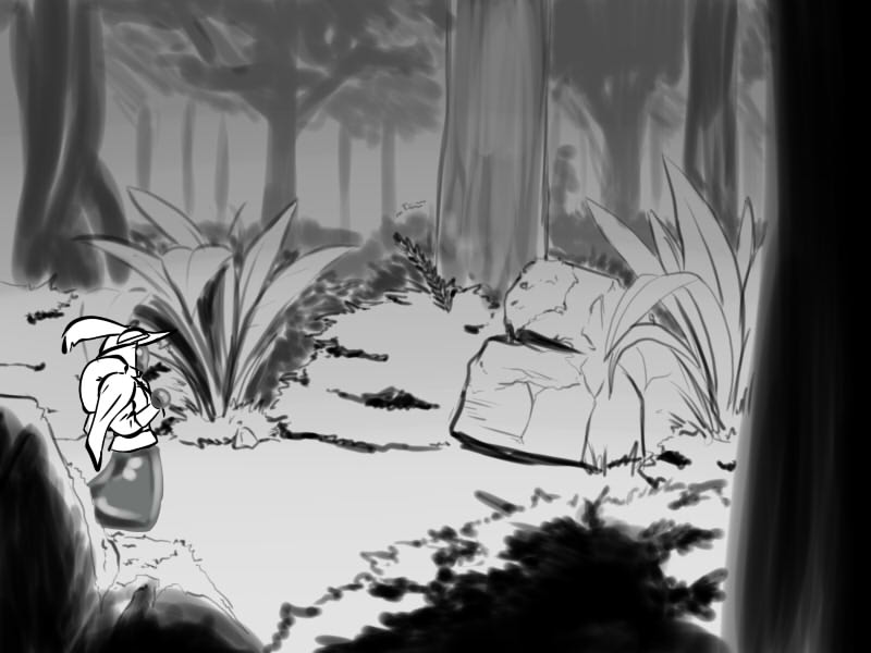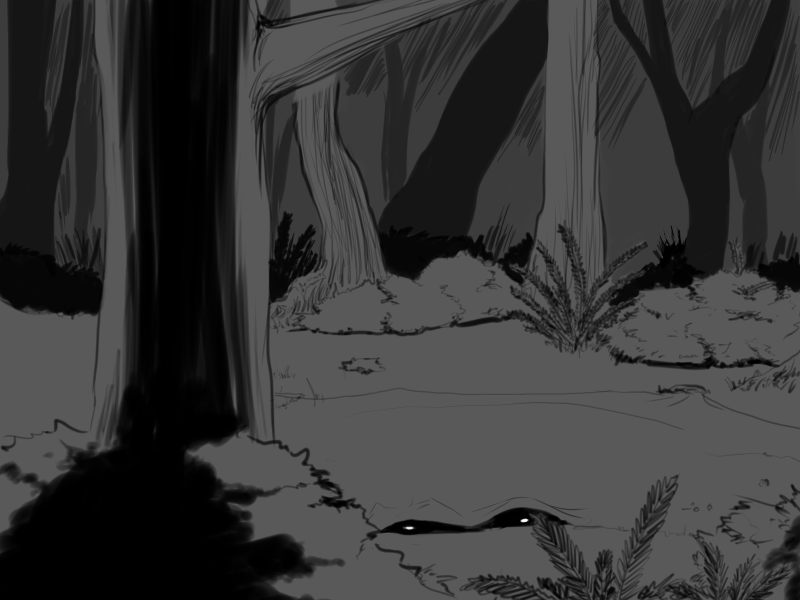 I take refuge behind a large tree. I can hear murmuring and whispers in the same Ancient Elvish language as before. A faint light can be seen from the other end of the thicket, I think it's emanating from the village. I peer around the tree and I see more shadowy figures, but these appear to be wearing much bulkier clothing, like armor. I can faintly hear the sharpening of blades over the sounds of the night forest. This certainly seems to bode ill.