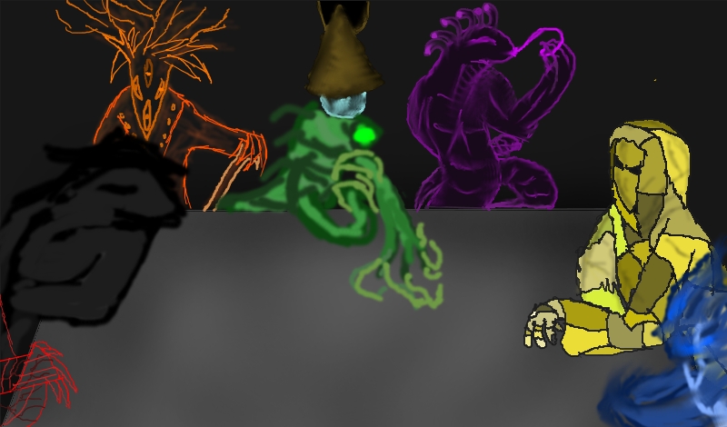 Orange (aside): hmm Black ceding the center is a risky move, he can do it and take a hit. But then his tactics and skills 'are' particularly suited to deceptions hidden in plain sight... he could reasonably take it back later. However, this would give Yellow a homeground advantage as the local ruins terrain 'is' more suited to his aligned units."