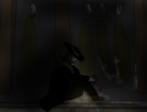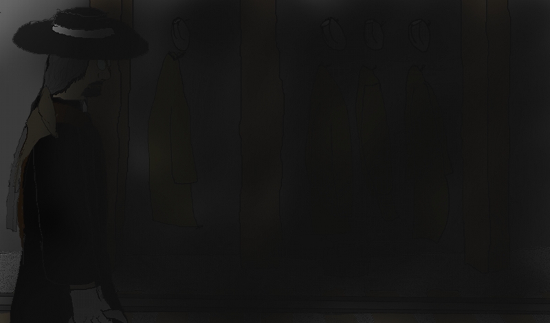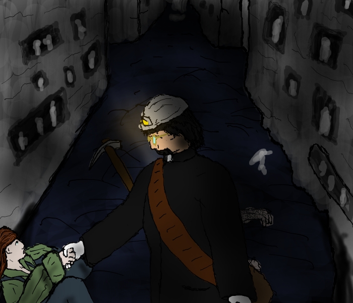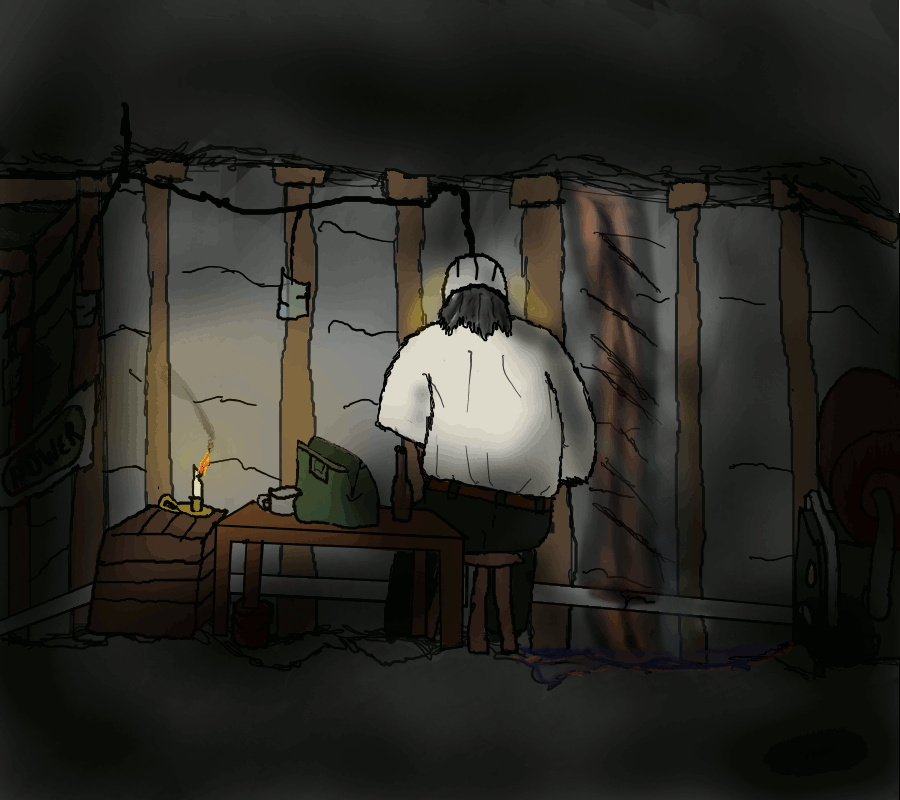 The beam of my flashlight reveals a line of yellowed work-coats and the sparkling lenses and steel of mining helmets.
