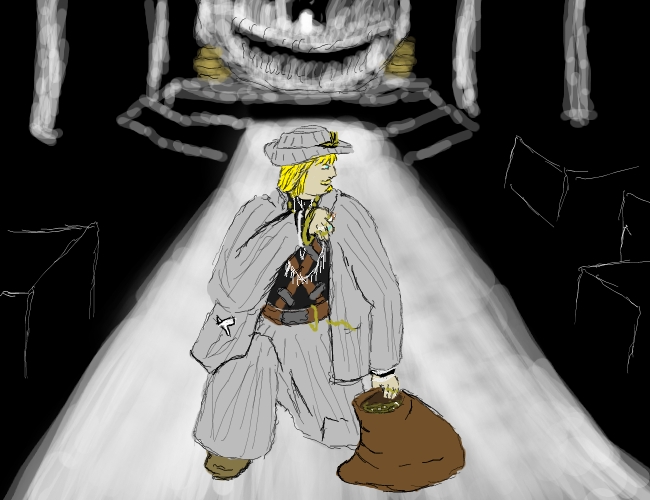 I spy with my little eye a satchel looking thing on the ground there. You should figure out what's in it.