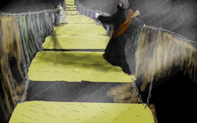 I hear a whine and sudden mechanical shriek as Fields is lost in the glare of a crackling shaft of obliterating energy, board are blasted to bits and chains spit sparks as the pyrotechnic spectacle sweeps back along the bridge, towards us.