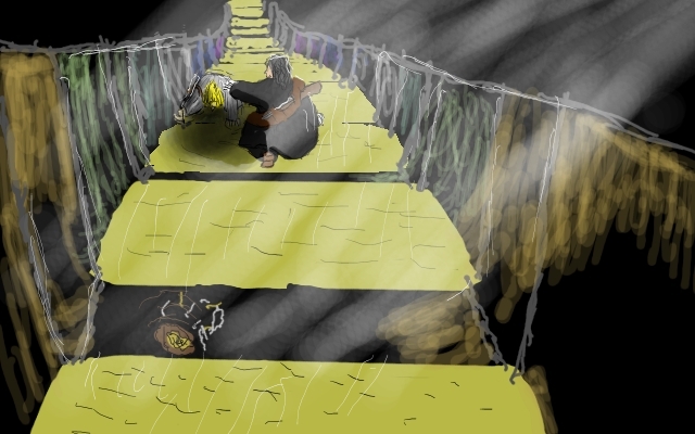 Think of your hands. Feel your hands holding the railing. Strong hands. You can do this. Just keep thinking about the feeling of your hands holding the railing.