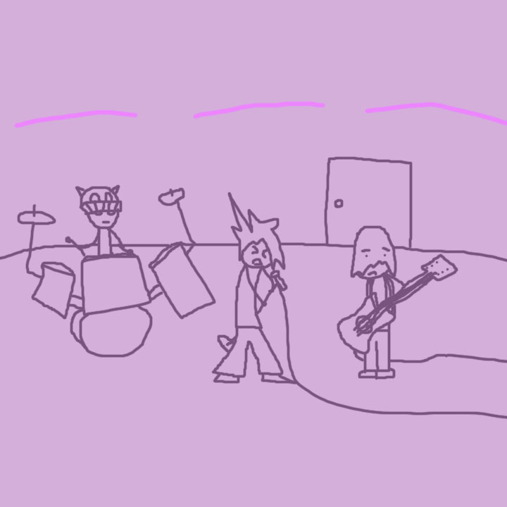 We enter the door to find a crappy screamo band having a jam session, and they have purple lights put up everywhere. There is a door on the other side of the room.