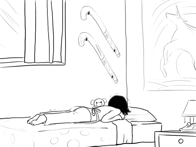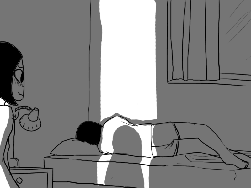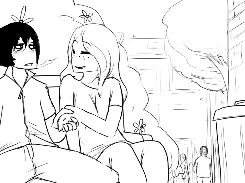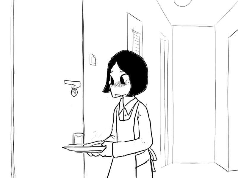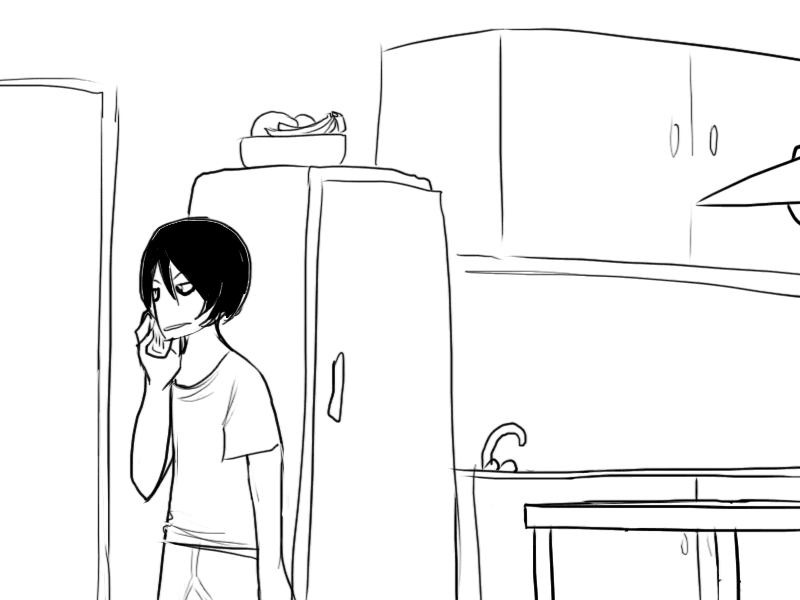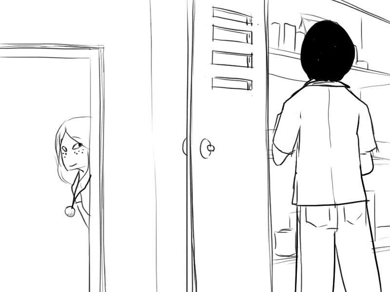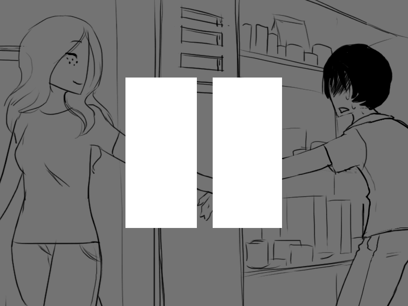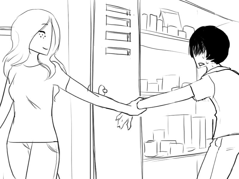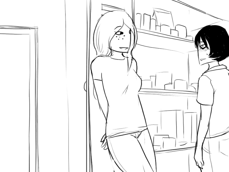 >"..Oh, uh.. I was trying to look for something to drink, but I see you only keep.. well, not drinks in here."