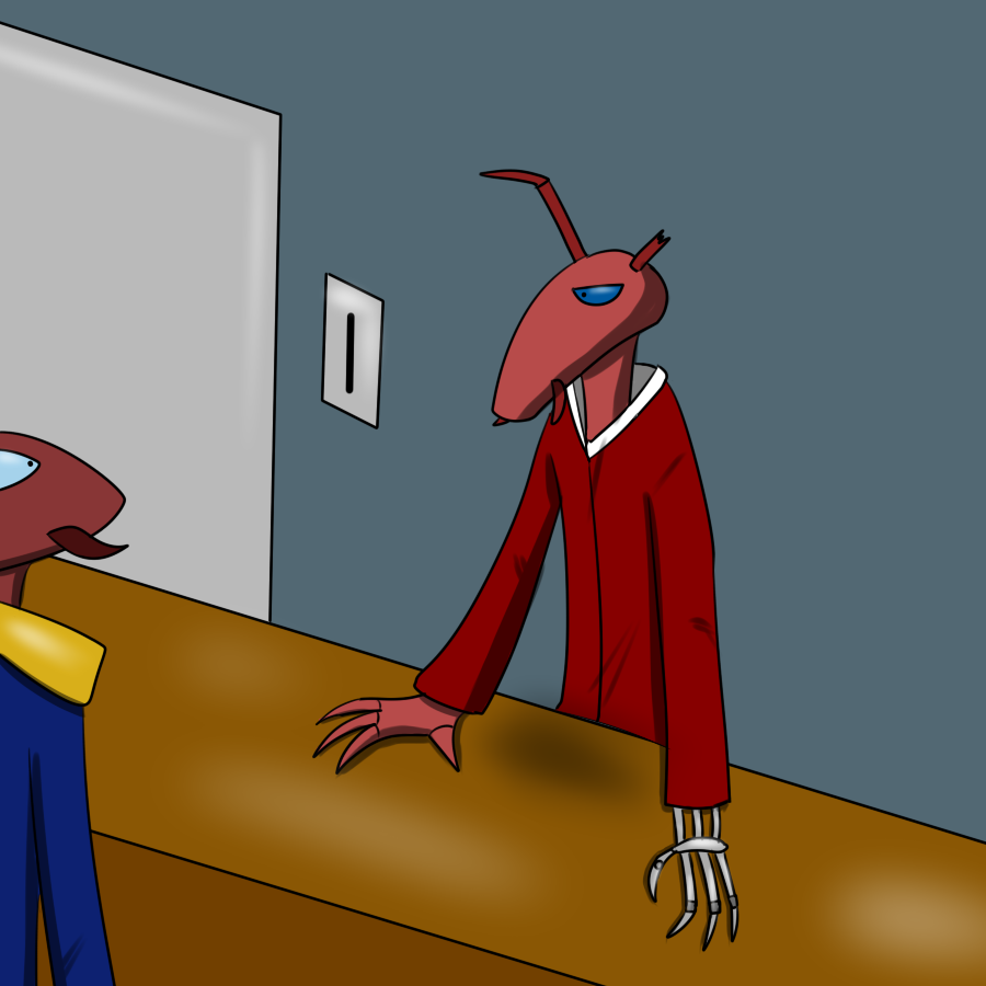 >Well, if you're done with the questions I guess I should go back to your work now. I've sealed the broken part of the carapace with quick-action plaster, and the nano-analgesics should stop most of the pain. You should be able to walk normally, but don't force it too much.