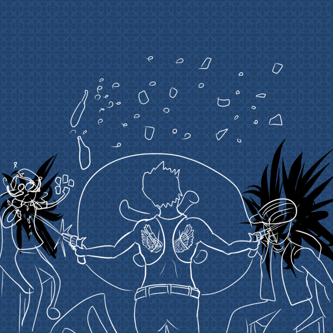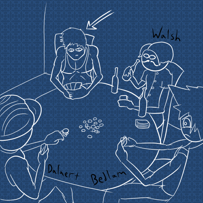 Bedlam is a mercenary. He's very grumpy because his little sister is out in the city somewhere, and he really wants to go find her. I can't blame him for being so antsy most of the time.