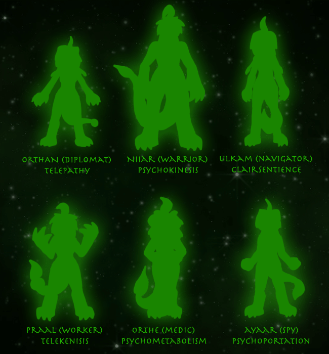 >Ulkam use their faculty with clairsentience in many different ways; the most famous of their number become navigators and pilots, guiding their course across planets and to the stars. Some others become research scientists, exploring the universe in a different way. They are not as strong as most other castes, but have somewhat more dexterity. Their tails release a heavy black mist that blocks sight and deadens sound, giving them the advantage over others.