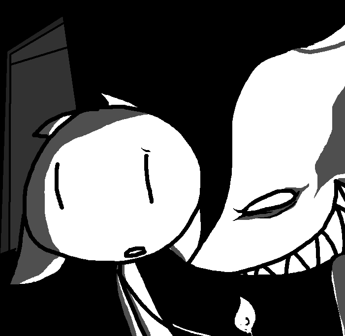 Nan and Anna arrive at ROOM 313. A cross is scrawled on the door. Anna knocks three times and identifies herself, saying she's arrived with a guest and needs to be let in.