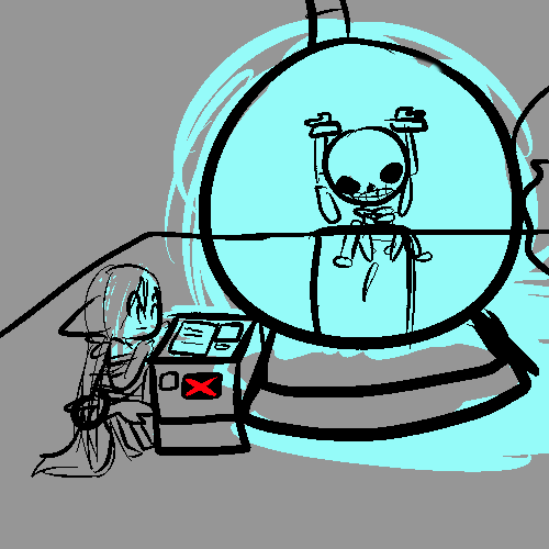 >After putting some pressure on the first chain, it breaks with a swift yank. POP. POP. the second chain gives away soon after. She lands on the bottom of the pod. Examining it. It appears to be made out of glass, but the inside of it is sticky instead of smooth, and there is strange blue clear glowing goop at the bottom. And as far as she can tell, the pod door open, is what let out all of the glowing gunk.