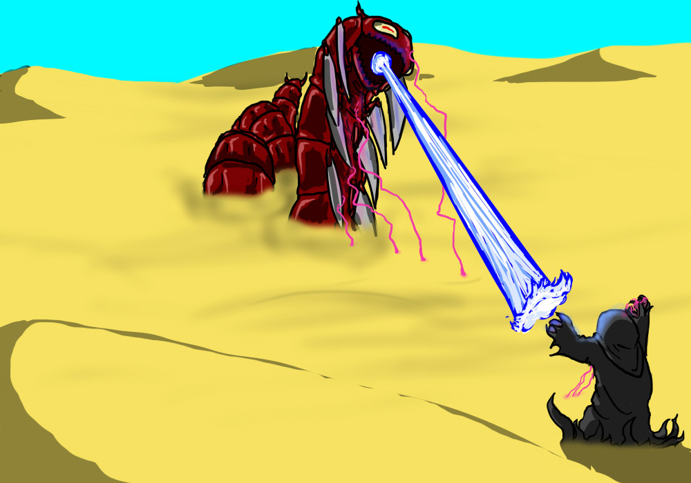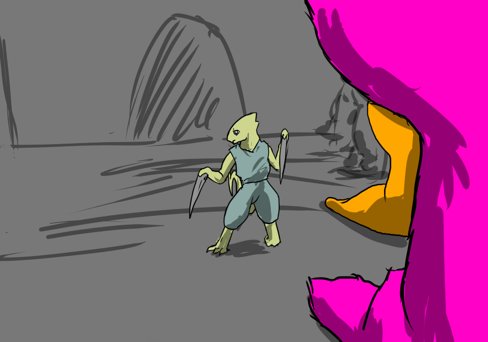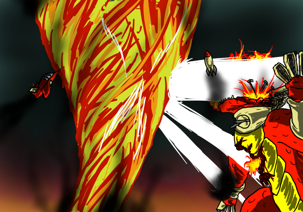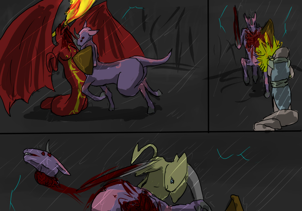 Holizen sends a gout of flame at the creature, but it goes wide, and the monster slams into her, impaling her on his lance and trampling her. Meanwhile, Ria has put a bit on antithesis on his blades. The substance is oily, slick, and the water doesn't affect it.