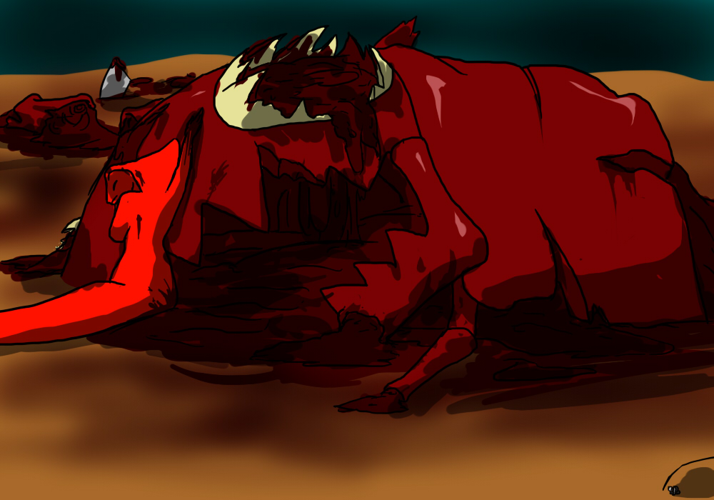 It doesn't take long for the creature to extract its lance and turn to Ria. She fires, hitting it in the chest and tearing pieces of flesh from it, but it barely slows until Spikesby leaps behind it and severs its head with a sweep of his blades.