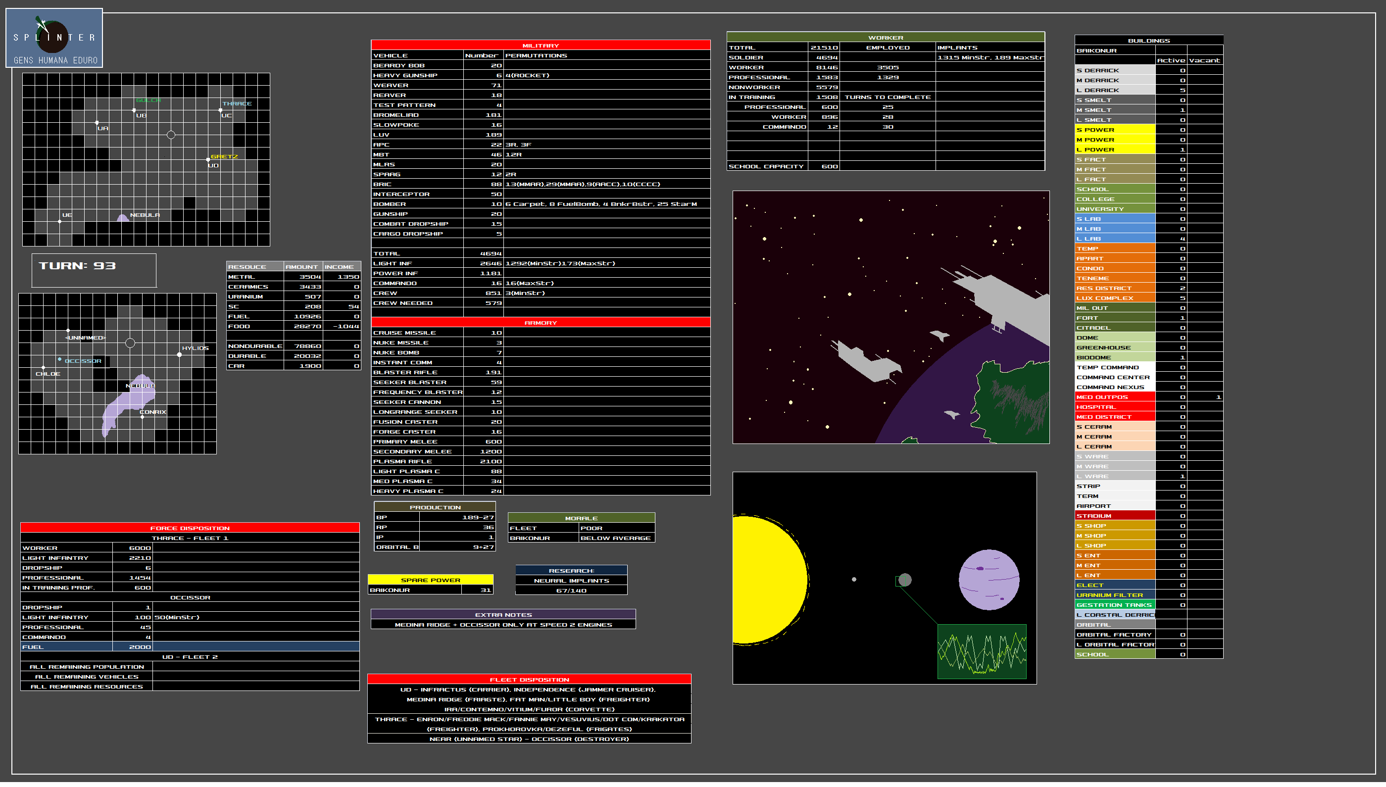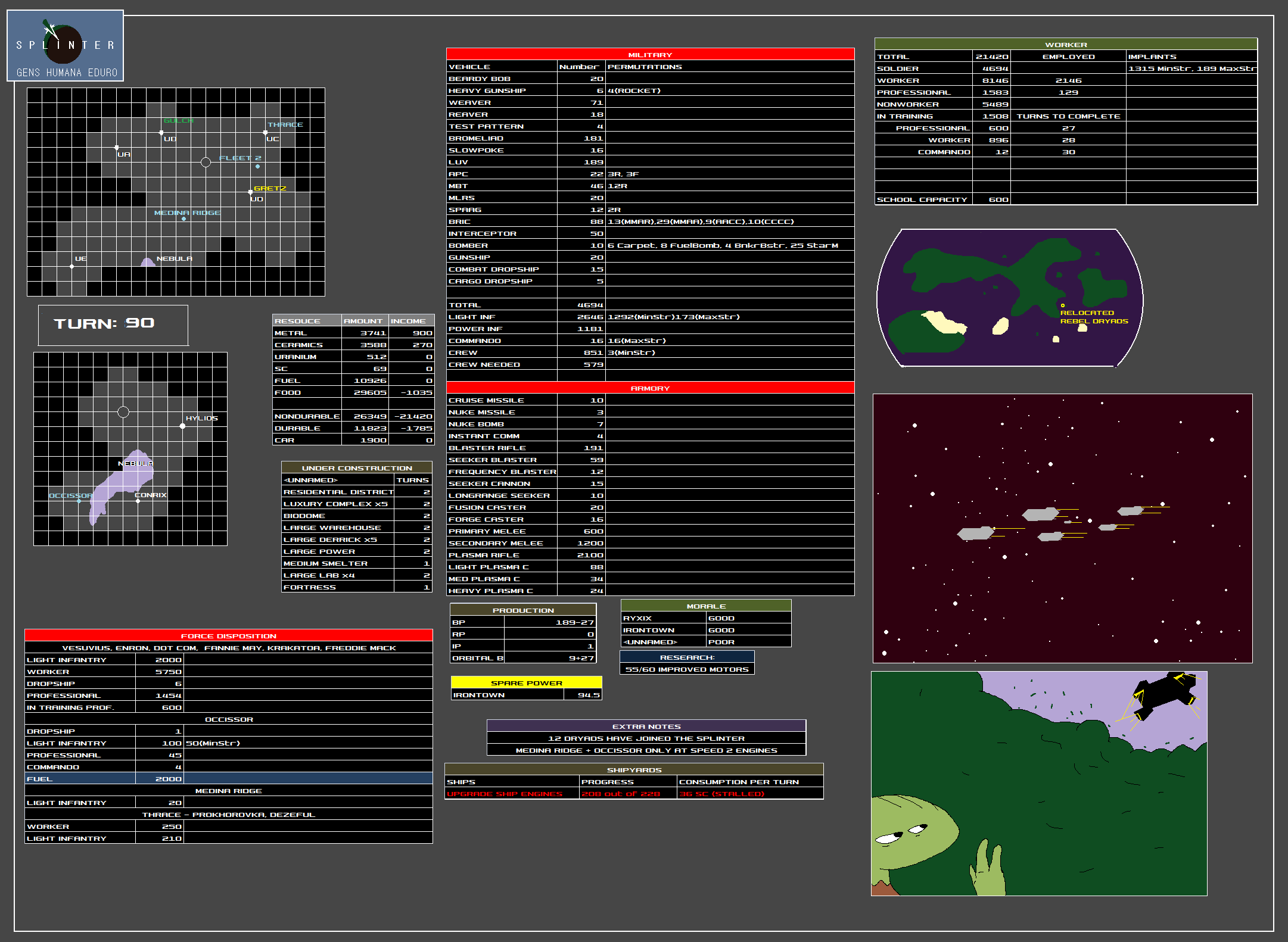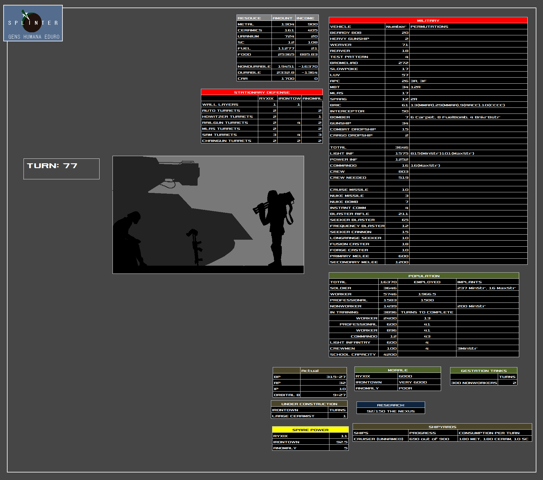 I think that covers everything. Let's cut back on the building and maybe start stockpiling resources, since options are bound to open up in a few turns. Current policy should be to not engage or provoke the enemy (aside from the decoy outpost), so we don't have to keep up with recovering battle losses.