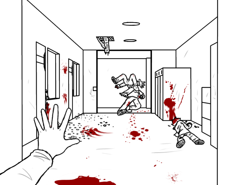 "Yeah, I woke up and something attacked me from the one-way mirror, but the glass exploded for some reason and there was blood all over and some guy exploded in his room and what the hell happened?"