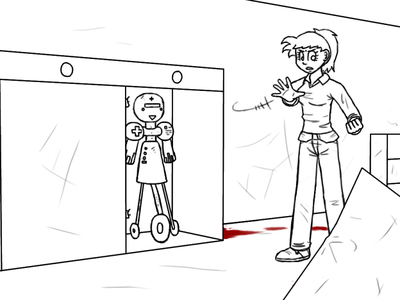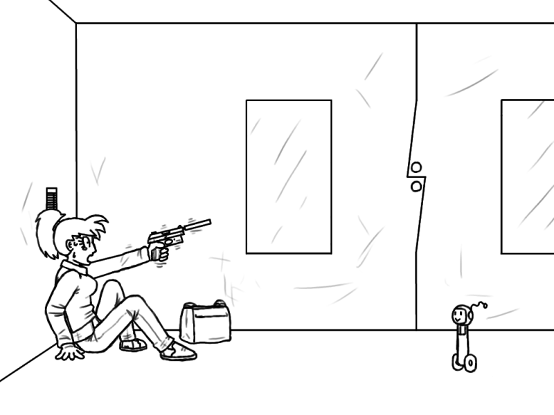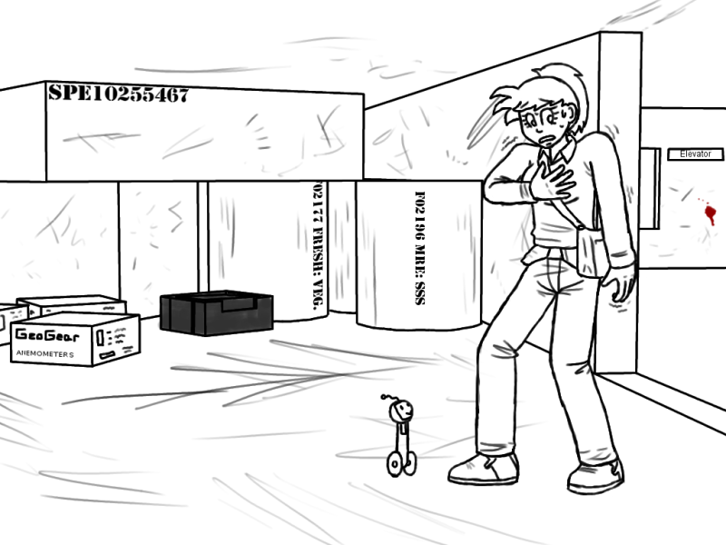 "WAIT! Don't shoot! I'm Sarah, remember? Lieutenant Taylor, we talked on the monitors! You told me to get your gun! And I brought the Wheelbot!"