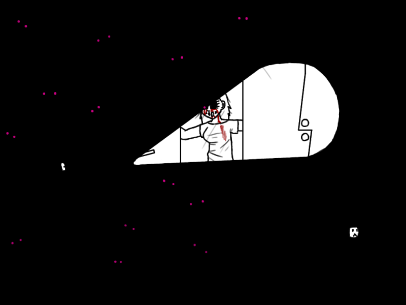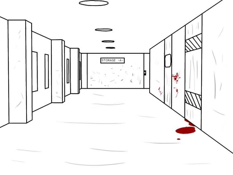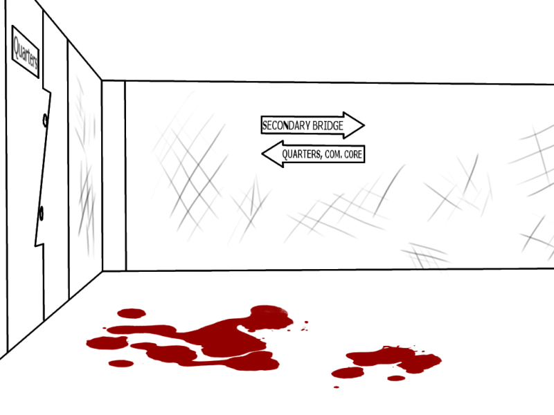 The door to the quarters automatically opens as I get near it, revealing a blood splatter and a long hallway with the living quarters. I can't remember which room is mine, but it feels like it's pretty far down this hall.