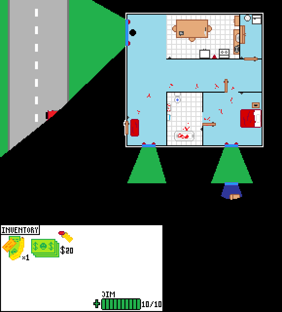 Next, Jim follows the trail of old, hardened blood. It seems to lead out the front door, which happens to be locked.